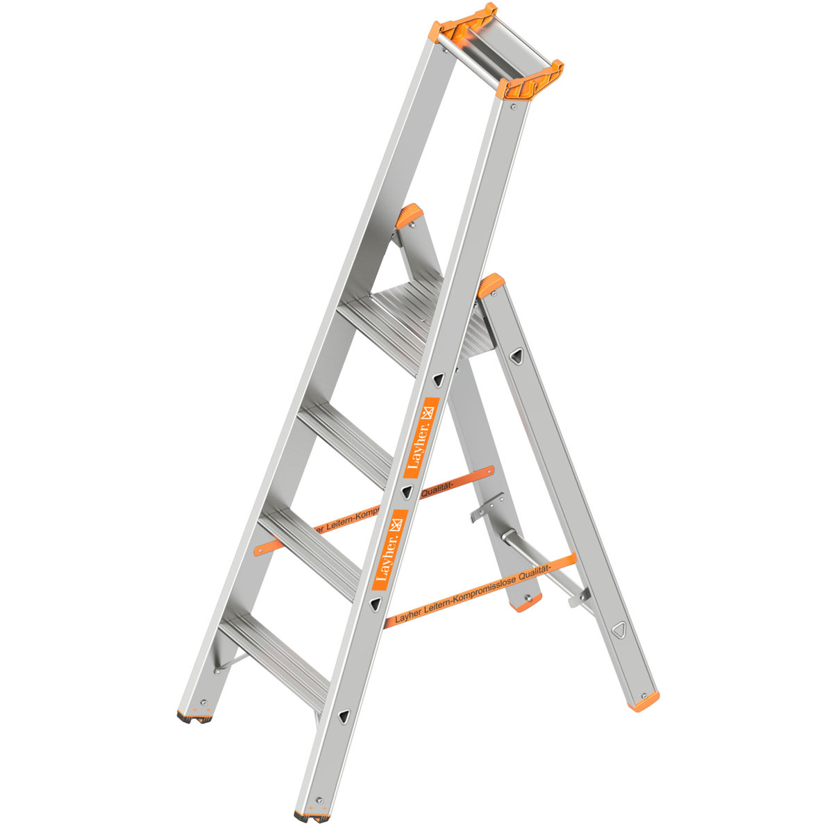 Aluminiumleitern von Layher stehen für Robustheit und Langlebigkeit bei geringem Gewicht und finden Anwendung in allen Gewerken. Die Stufen sind gefertigt aus hochfesten, geschlossenen Strangprofilen ohne Längsschweißnaht mit hoher Beanspruchbarkeit. Sie sind in den Holm 4-fach verpresst. Für ein hohes Maß an Trittsicherheit sorgt die strak geriffelte Trittfläche der Stufen. Zusätzliche Aussteifer am Holmende sorgen für ein Übertreffen der Werte der DIN EN 131.Sicherer Stand durch Podest, verlängerte Holme und Knieleist. Zum Transport faltet sich das Podest hoch.Inklusive fest montierter Ablageschale am oberen HolmendeReißfeste Polyester-Gurtbänder als SpreizsicherungCombigrip Leiternfüße mit spezieller Auflagefläche sorgen für rutschsicheren Stand.