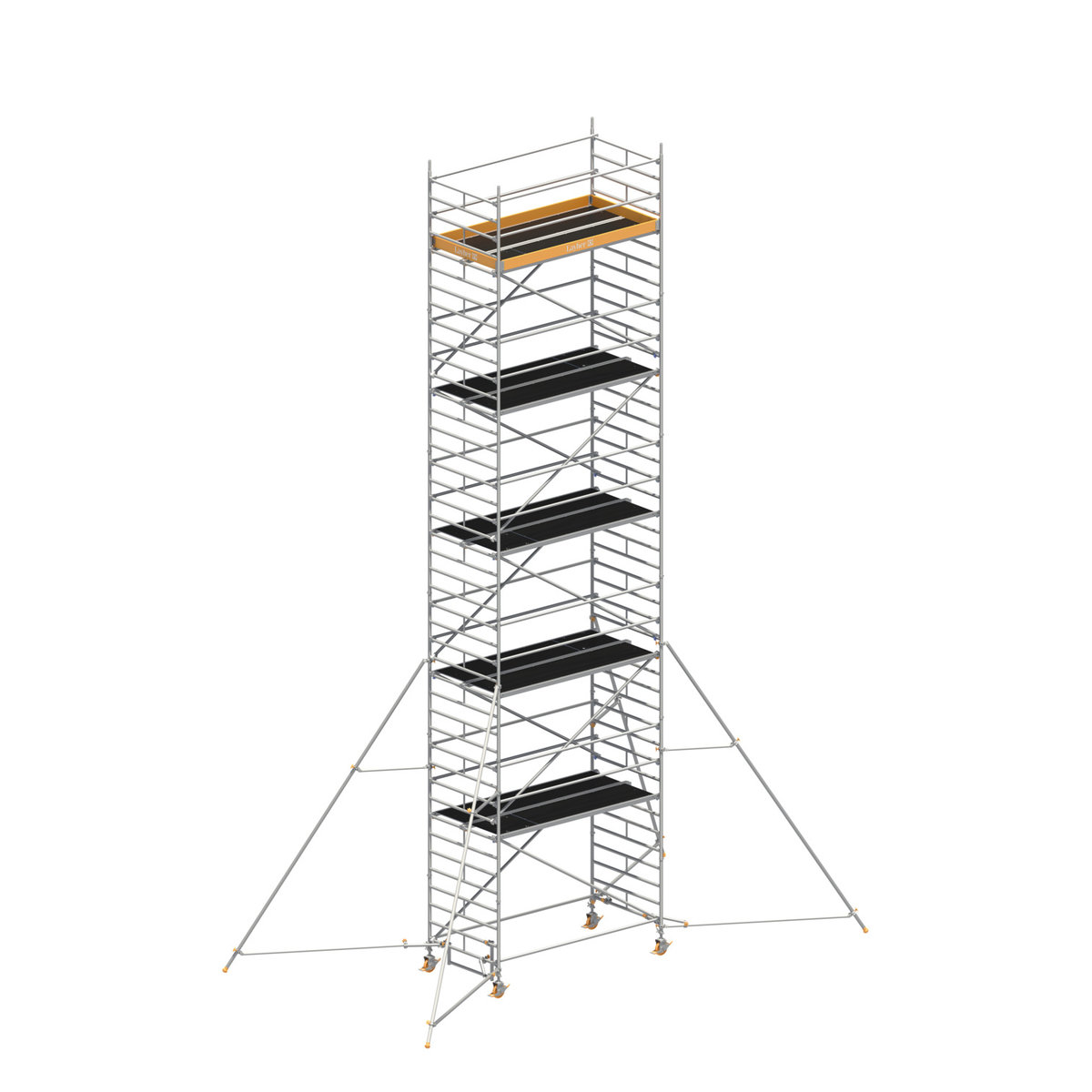 Das Layher Universalgerüst Uni Breit P2 mit dem doppelt breiten Arbeitsboden ist der bequeme Arbeitsplatz in der Höhe.Ideal für Arbeiten mit sperrigem Material und dazu notwendiger Bewegungsfreiheit.Standleitern (1,5 m breit) aus Aluminium für Steckmontage; Geländer und Diagonalen aus Aluminium sind einfach einzurasten.Arbeitsböden aus Aluminium-Rahmen und Sperrholz-Einlage (BFU 100) als Durchstieg für gefahrlosen Innenaufstieg; vorschriftsmäßige Ruhepodeste bereits integriert.Robuste Lenkrollen mit zentrischer Lasteinleitung nach Arretierung für besondere Standfestigkeit sowie Stahlspindeln zum Niveauausgleich.Basisverbreiterung: mit Fahrbalken aus Stahl, teleskopierbar für wahlweises Arbeiten an Decke oder Wand, erst ab 8,60 m Arbeitshöhe notwendig; alternativ mit Gerüststützen.Für noch mehr Sicherheit und komfortablen Aufstieg Stufeneinhängeleitern mit breiten Trittstufen.Arbeits…
