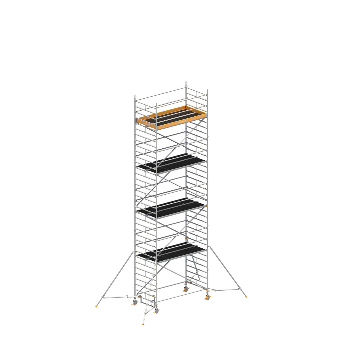 Das Layher Universalgerüst Uni Breit P2 mit dem doppelt breiten Arbeitsboden ist der bequeme Arbeitsplatz in der Höhe.Ideal für Arbeiten mit sperrigem Material und dazu notwendiger Bewegungsfreiheit.Standleitern (1,5 m breit) aus Aluminium für Steckmontage; Geländer und Diagonalen aus Aluminium sind einfach einzurasten.Arbeitsböden aus Aluminium-Rahmen und Sperrholz-Einlage (BFU 100) als Durchstieg für gefahrlosen Innenaufstieg; vorschriftsmäßige Ruhepodeste bereits integriert.Robuste Lenkrollen mit zentrischer Lasteinleitung nach Arretierung für besondere Standfestigkeit sowie Stahlspindeln zum Niveauausgleich.Basisverbreiterung: mit Fahrbalken aus Stahl, teleskopierbar für wahlweises Arbeiten an Decke oder Wand, erst ab 8,60 m Arbeitshöhe notwendig; alternativ mit Gerüststützen.Für noch mehr Sicherheit und komfortablen Aufstieg Stufeneinhängeleitern mit breiten Trittstufen.Arbeits…
