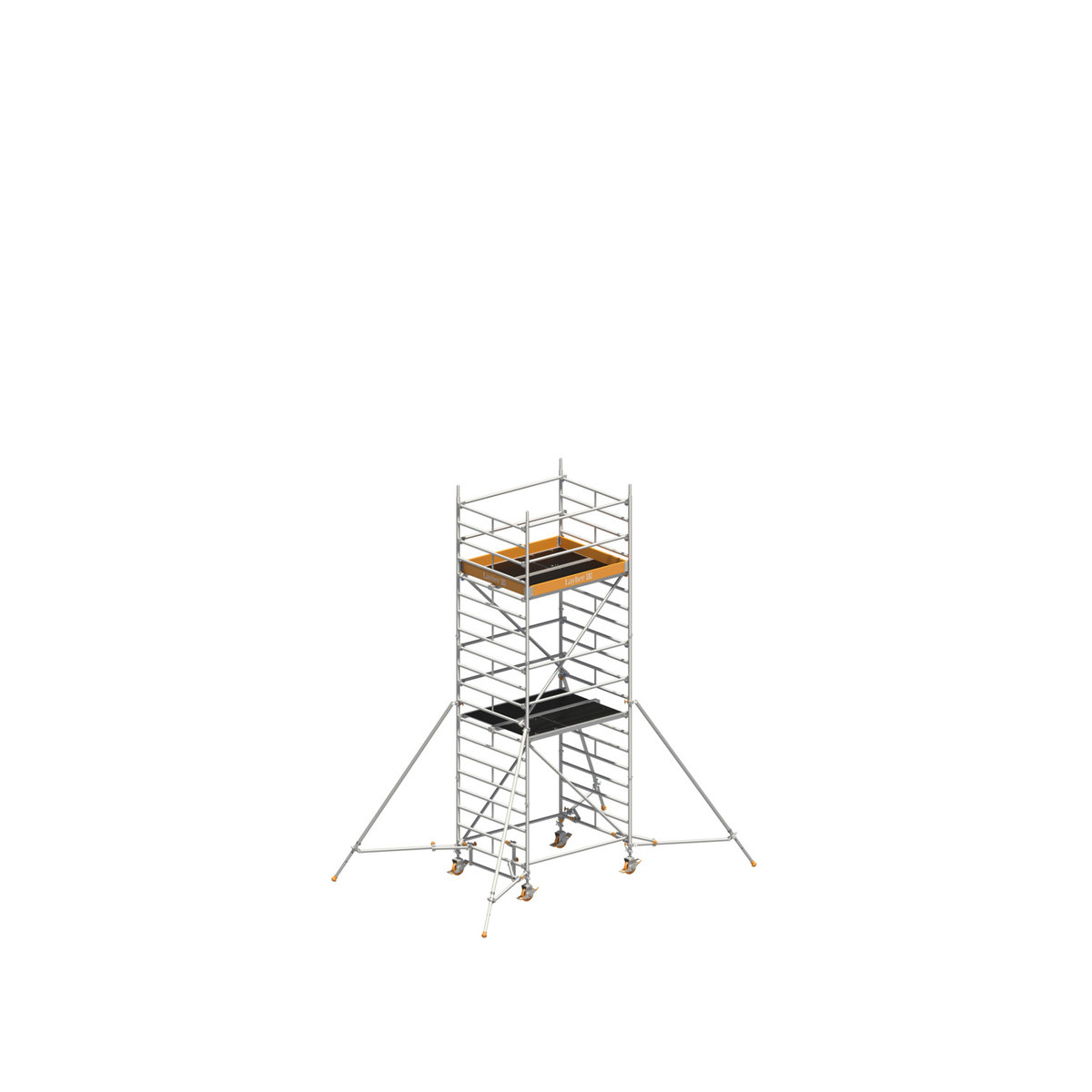 Das Universalgerüst Uni Kompakt P2, mit doppelt breitem Arbeitsboden und dennoch kompakten Grundmaßen , bietet ausreichend Bewegungsfreiheit in der Höhe – auch für Arbeiten mit Material.Standleitern (1,50 m breit) aus Aluminium für Steckmontage; Geländer und Diagonalen aus Aluminium sind einfach einzurasten. Arbeitsböden aus Aluminium-Rahmen und Sperrholz-Einlage (BFU 100) als Durchstieg für gefahrlosen Innenaufstieg; vorschriftsmäßige Ruhepodeste bereits integriert.Robuste Lenkrollen mit zentrischer Lasteinleitung nach Arretierung für besondere Standfestigkeit sowie Stahlspindeln zum Niveauausgleich.Basisverbreiterung: mit Fahrbalken aus Stahl, teleskopierbar für wahlweises Arbeiten an Decke oder Wand, erst ab 8,38 m Arbeitshöhe notwendig.Arbeitshöhe: 10,38 m.Fläche Arbeitsbühne: 1,50 x 1,80 m.Zulässige Verkehrslast: 2 kN/m² (Gerüstgruppe 3)