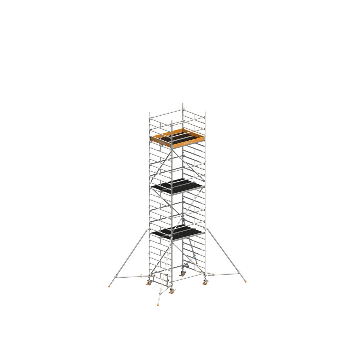 Das Universalgerüst Uni Kompakt P2, mit doppelt breitem Arbeitsboden und dennoch kompakten Grundmaßen , bietet ausreichend Bewegungsfreiheit in der Höhe – auch für Arbeiten mit Material.Standleitern (1,50 m breit) aus Aluminium für Steckmontage; Geländer und Diagonalen aus Aluminium sind einfach einzurasten. Arbeitsböden aus Aluminium-Rahmen und Sperrholz-Einlage (BFU 100) als Durchstieg für gefahrlosen Innenaufstieg; vorschriftsmäßige Ruhepodeste bereits integriert.Robuste Lenkrollen mit zentrischer Lasteinleitung nach Arretierung für besondere Standfestigkeit sowie Stahlspindeln zum Niveauausgleich.Basisverbreiterung: mit Fahrbalken aus Stahl, teleskopierbar für wahlweises Arbeiten an Decke oder Wand, erst ab 8,38 m Arbeitshöhe notwendig.Arbeitshöhe: 10,38 m.Fläche Arbeitsbühne: 1,50 x 1,80 m.Zulässige Verkehrslast: 2 kN/m² (Gerüstgruppe 3)