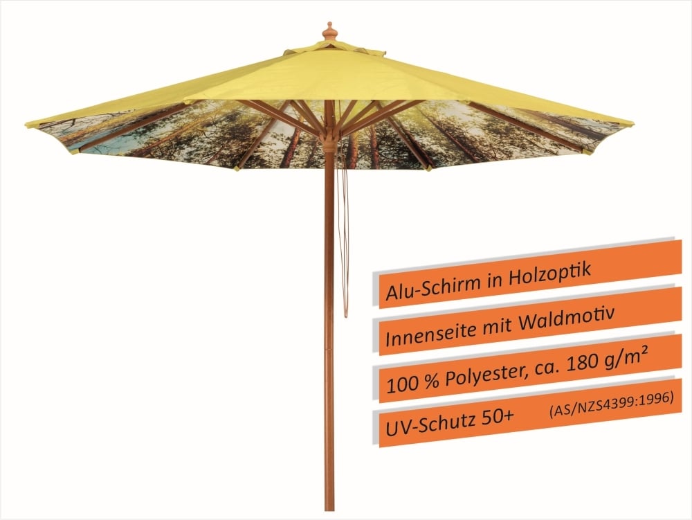 Marktschirm Malaga Mit unserem Sonnenschirm Malaga Forest holen Sie sich ein Stück Wald direkt in Ihren Garten oder auf Ihre Terrasse. Warum sollte das Motiv eines Sonnenschirms auf der Außenseite gedruckt werden? Stattdessen haben wir das Motiv auf der Innenseite gedruckt, damit Sie die fröhlichen und bunten Farben direkt unter dem Schirm genießen können. Die Verbindung aus dem Gestell in Holzoptik und dem Waldmotiv auf der Innenseite erzeugt eine ganz besondere Atmosphäre und hinterlässt einen bleibenden Eindruck bei Ihren Gästen. Malaga Forest – der Blickfang Der Sonnenschirm Malaga Forest ist ein Mittelmastschirm mit einer Größe von ca. 300 cm Ø. Die Bespannung besteht aus 100 % Polyester und hat eine Stoffstärke von 180 g/m², was sie sehr widerstandsfähig macht. Zudem ist sie verrottungsfest und ohne Volant gefertigt. Außerdem ist der Bezug mit einer wasserabstoßenden Imprägnierung versehen, wodurch er auch einem kurzen Regenschauer standhält und im Nu wieder getrocknet ist. Der Schirm Malaga besitzt einen ausgezeichneten UV-Schutz von 50+. Dieser wurde nach ausführlichen Testreihen, gemäß der australisch-neuseeländischen Norm (AS/NZ4399:1996) vergeben. Besondere Merkmale Das Gestell besteht aus pulverbeschichtetem Alu/Stahl in Holzoptik. Der Stock hat einen stabilen Durchmesser von ca. 48 mm Ø und ist zweiteilig, wodurch Sie den Schirm problemlos auseinanderbauen und über den Winter platzsparend einlagern können. Alle Kunststoffteile wie z.B. die Krone und der Schieber sind ebenfalls in Holzoptik. Außerdem verfügt dieser Sonnenschirm über einen doppelten Seilzug, womit er geöffnet bzw. geschlossen werden kann, sowie einen Sicherungssplint. Die Gesamthöhe des Schirmes beträgt ca. 257 cm, mit einer Durchgangshöhe von ca. 205 cm. Zubehör Bei der Wahl des Schirmständers empfehlen wir einen Schneider Schirmständer mit einem Mindestgewicht von ca. 40 kg, z.B. PE-Ständer ca. 40 kg anthrazit (Art. 857-15). Alternativ können Sie auch die folgenden Artikel im Zusammenhang mit diesem Schirmmodell verwenden: Plattenständer für Wegeplatten mit einer Größe von 40 x 40 cm oder 50 x 50 cm (Art. 837-15, Lieferung erfolgt ohne Platten), Bodendübel (Art. 888-00), Bodenhülse (Art. 827-00), Betonständer ca. 40 kg anthrazit (Art. 898-15) oder Granitständer ca. 42 kg (Art. 869-00). Außerdem empfehlen wir Ihnen den Schirm bei Nichtgebrauch mit der passenden lichtundurchlässigen Schutzhülle abzudecken, um die Lebensdauer Ihres Schirmes zu erhöhen (Art. 821-00).