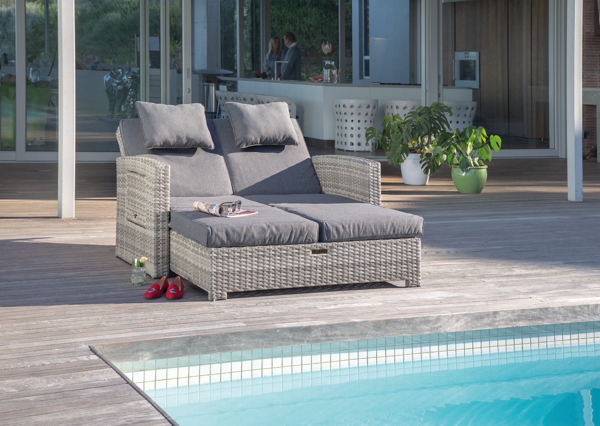 Die Liege verfügt zudem über 2 hochklappbare Seitentische, die Platz für Getränke, Bücher oder Sonnencreme bieten. Das Fußteil der Liege kann ausgezogen werden und verwandelt die Liege in ein Sofa oder Bett. Die Liege wird inklusive Auflagen und 2 Nackenkissen in anthrazit geliefert.