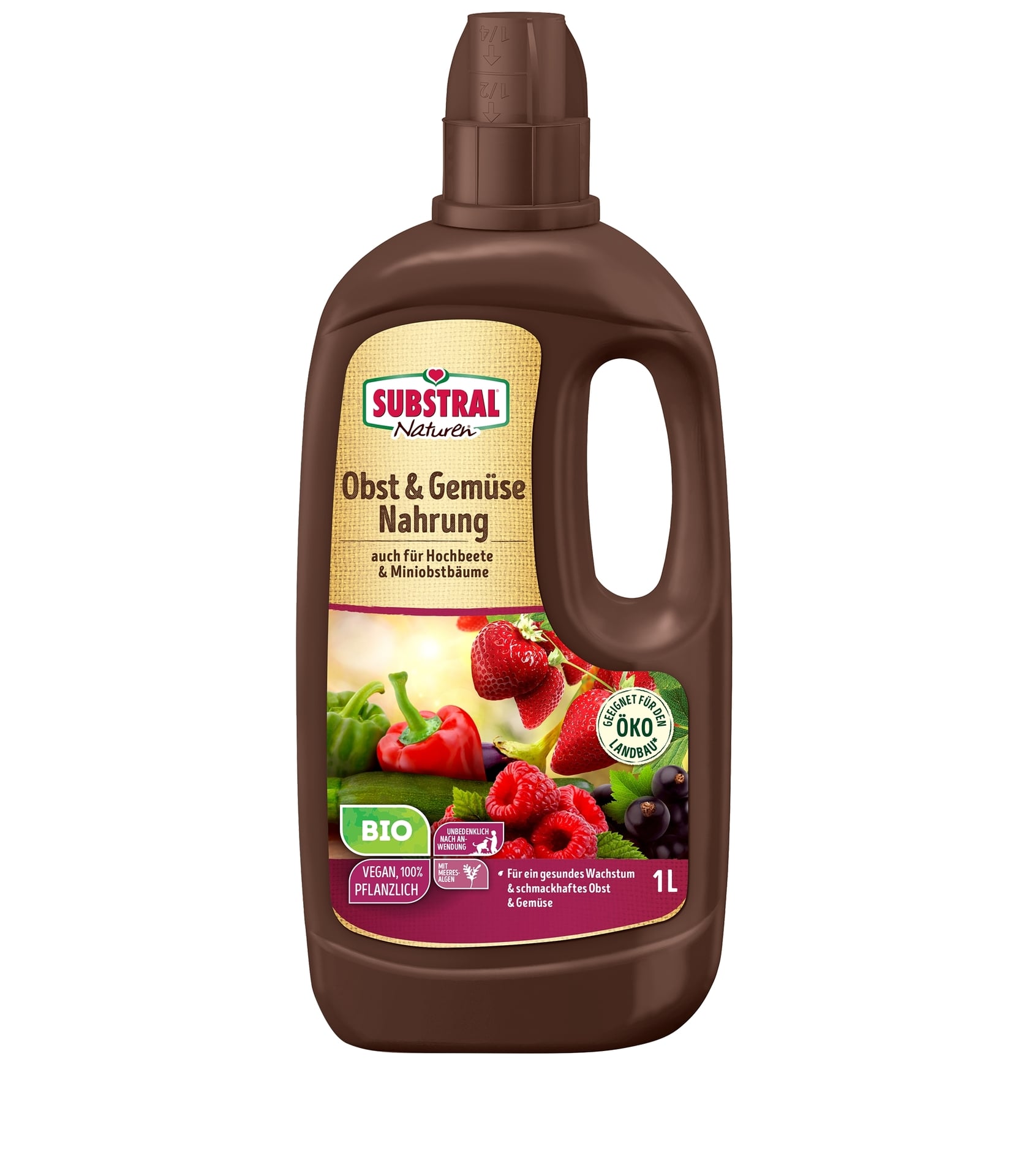 Auch für Hochbeete & MiniobstbäumeSubstral Naturen Obst & Gemüse Nahrung Bio ist ein rein pflanzlicher (veganer) Flüssigdünger mit Braunalgen, der Ihre Pflanzen mit wichtigen Nährstoffen versorgt. Er fördert das Wachstum, die Blüten- und Fruchtbildung und sorgt für eine reiche Ernte und aromatische Früchte. Für Obstbäumchen in Kübelkultur, Erdbeeren, Salat, Radieschen, Karotten, Terrassen- & Balkongärten aber auch für Hochbeete. Substral Naturen Bio Dünger wurden für Hobbygärtner entwickelt, die ein Gleichgewicht zwischen wirksamer Ernährung Ihrer Pflanzen und dem Einsatz von natürlichen Düngern wünschen. * Die Ausgangsstoffe sind gemäß Verordnung EG 834/2007 idgF für die ökologische/biologische Produktion geeignet. Sie wurden konventionell erzeugt.