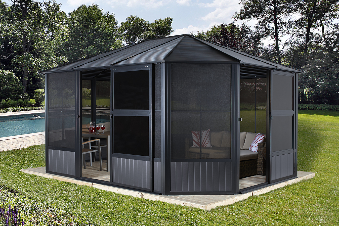 Pavillon Charleston Kanadas Nr. 1 in Pavillons SOJAG Aluminium Pavillon Charleston 12×12 mit Hard-Top Modern, langlebig und eine tolle Optik sind Merkmale für die neuen Aluminiumpavillons vom größten und bekanntesten kanadischen Pavillon Produzenten SOJAG. Konstruktion aus pulverbeschichtetem Aluminium, Schrauben aus rostfreiem Edelstahl. Das massive Dach besteht aus galvanisiertem Stahl und bietet im Sommer ein schattiges Plätzchen im Garten. Die außergewöhnliche Schneelast von 150 kg/m² spricht für eine enorme Qualität. Kontrollierbare Durchlüftung durch 10 Fenster (eins in jedem Wandelement – 94×74 cm BxH) bestehend aus je einem Moskitonetz sowie einem reißfesten PVC-Folien-Fenster, welches zur Durchlüftung einfach nach unten geschoben und mit zwei Handgriffen zum Reinigen herausgenommen wird. Der Aufbau erfolgt durch mindestens 2 Personen mit Hilfe von handelsüblichen Werkzeugen sowie einer detaillierten Schritt-für-Schritt Anleitung. Die Schiebetüren können flexibel auf allen Seiten montiert werden. Zu beachten ist, dass je nach Seite nur eine Tür eingesetzt werden kann. Aufbauzeit ca. 6 Stunden. Der Rahmen wird durch Schrauben & Dübeln (nicht im Lieferumfang enthalten) am bestehenden Untergrund befestigt. Der Pavillon kommt mit 5 Jahren Herstellergarantie* (siehe Garantiebestimmung) gegen Rost auf alle Aluminiumteile und ist für den ganzjährigen Gebrauch geeignet. – Breite: 384, – Gewicht: 205, – Höhe: 281, – Länge: 384