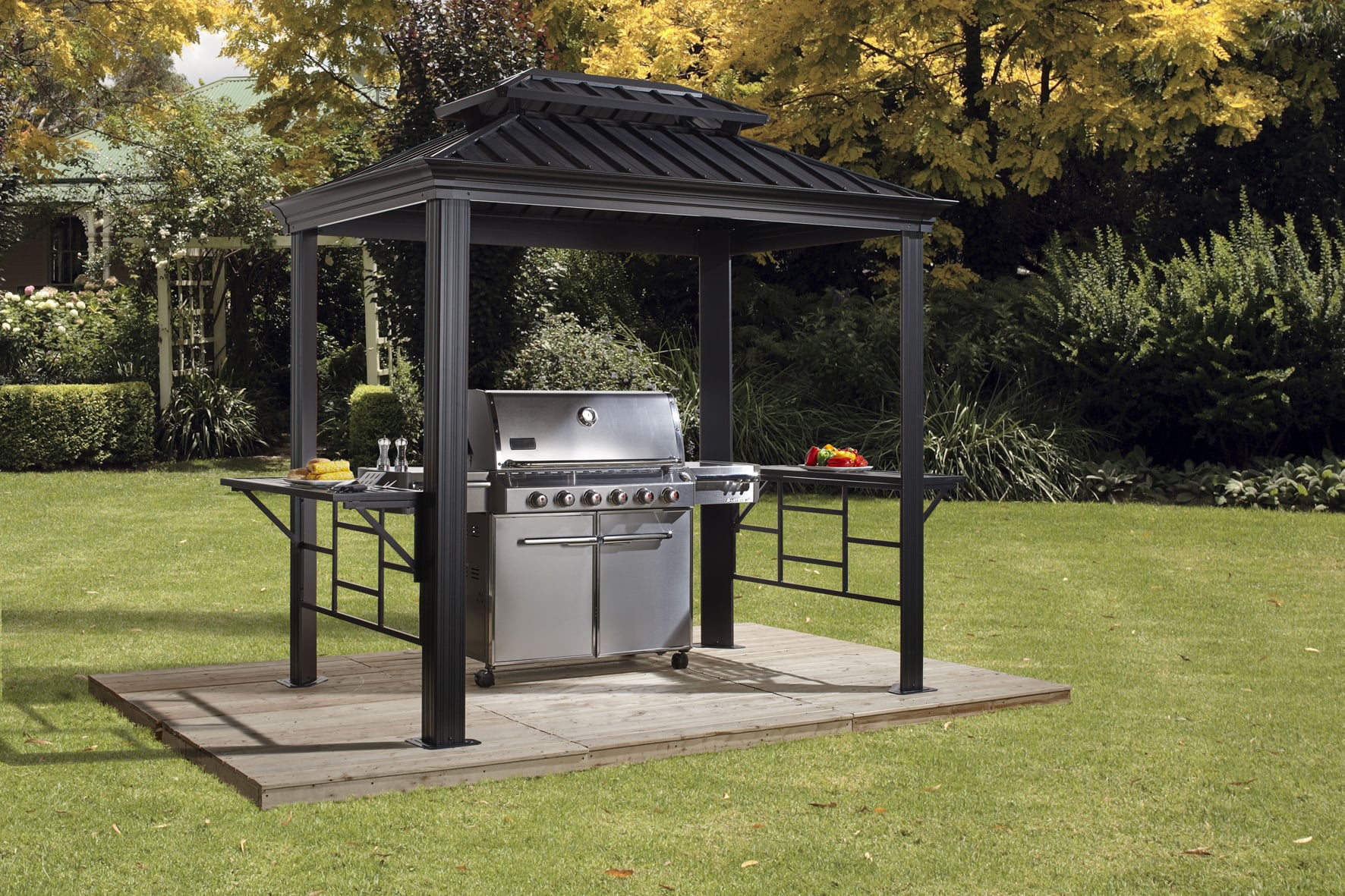 Pavillon Messina Deutschlands größtes Sortiment an Aluminium Pavillons SOJAG Aluminium BBQ Grill Pavillon mit Hard-Top Für den enthusiastischen Grill Liebhaber konzipiert – von Kanadas Nr.1 in Pavillons – SOJAG. Keine Ausreden mehr; mit dem neuen BBQ Pavillon aus der Messina Serie verlängerst Du die Grillsaison auf 365 Tage im Jahr. Hochwertige, 12 cm starke Konstruktion aus robustem, rostfreiem Aluminium in edler Optik. Angenehme Seitenhöhe (ca. 200cm). Das Dach besteht aus galvanisiertem, ständig formschönen Stahl und macht diesen Pavillon so besonders & einzigartig. Kein lästiges Abbauen im Winter; der BBQ Messina ist für den ganzjährigen Outdoorbedarf konzipiert. Rostfreie Edelstahlschrauben sowie massive 150kg/m² Schneelast sprechen für eine hohe Lebensdauer und enorme Stabilität. Mit integrierten Regenrinnen für eine geregelten Abfluss von Regenwasser. Der neue Lieblingsplatz für Dein Lieblingsgerät; ob als Unterstand bei Regen oder als schattiges Plätzchen an heißen Sommertagen, der BBQ Pavillon Messina bietet Dir Schutz bei Wind & Wetter. Durchdachte Konzeption mit zwei 134cm breiten und in angenhemer Stehhöhe (90cm)montierten Seitenlablagen für Grillwerkzeuge, Geschirr, Fleisch oder Getränke. Der im Dach integrierte, große Rauchablass verhindert Hitzestau und unangenehmes Ansammeln von Rauch. Der Star bei Deiner nächsten Grillparty. Einfacher Aufbau mit Hilfe von handelsüblichen Werkzeugen (Akkuschrauber, Schraubendreher, Leiter (nicht im Lieferumfang enthalten) sowie einer detaillierten Schritt-für-Schritt Anleitung. Aufbauzeit erfahrungsgemäß ca. 3-4 Stunden mit 2 Personen. Als Untergrund empfehlen wir eine ebene Fläche aus Holz, Beton oder Pflastersteinen. Schraubenkit zur Verankerung am Boden wird nicht mitgeliefert. 5 Jahre Herstellergarantie* (siehe Garantiebestimmung) gegen Durchrostung. – Breite: 292, – Gewicht: 78, – Höhe: 262, – Länge: 179