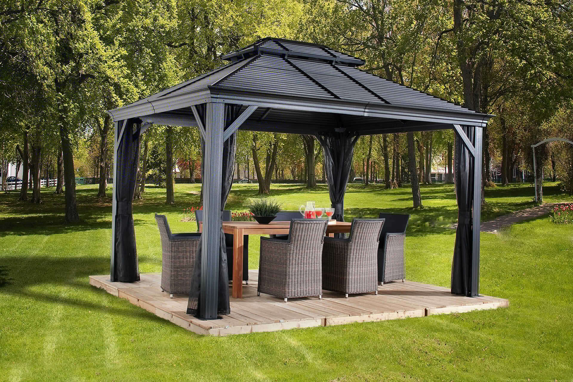 Pavillon Mykonos Kanadas Nr. 1 in Pavillons SOJAG Premium Aluminium Pavillon Mykonos 10×12 mit HardTop Modern, langlebig und eine tolle Optik sind Merkmale der neuen Aluminiumpavillons vom größten und bekanntesten kanadischen Pavillon Produzenten SOJAG. Der wesentliche Unterschied zu anderen Pavillons liegt im Material des Daches. Hier wird anstelle von Kunststoffplatten oder Stoff langlebiger und ständig formschöner Stahl verwendet. Außergewöhnliche 150kg/m² Schneelast und alle Aluminiumteile dauerhaft rostfrei! Die galvanische Beschichtung hält sämtlichen Witterungen ob Regen, Schnee oder Sonne ohne Probleme Stand. Das gleiche gilt für die massive Konstruktion aus resistentem, pulverbeschichtetem Aluminium (Pfostenstärke 12cm). Selbst die Schrauben bestehen aus rostfreiem Edelstahl. Der Pavillon muss daher im Winter nicht abgebaut werden. Mit doppeltem Dach zur besseren Durchlüftung und Vermeidung von Hitzestau. Mit integrierten Regenrinnen für einen geregelten Abfluss von Regenwasser. Im Lieferumfang enthalten sind Moskitonetze aus Nylon und zweigleisige Laufschienen zur zusätzlichen Anbringung von Vorhängen (sperarat als Zubehör erhältlich). Im Gegensatz zu anderen Modellen gilt hier nicht entweder oder, sondern es können sowohl Moskitonetze (bereits inbegriffen) als auch Vorhänge gleichzeitig genutzt werden. Das Modell Mykonos ist in einem edlen Anthrazitgrau gehalten. Optisch passende Vorhänge (Dunkelgrau) separat erhältlich. Der Aufbau ist unkompliziert und kann durch 2 Personen mit Hilfe der detaillierten Schritt-für-Schritt Anleitung sowie handelsüblichen Werkzeugen durchgeführt werden. Für den Aufbau sollten circa 4-5 Stunden eingeplant werden. Die Füße der Pfosten besitzen jeweils 3 Bohrungen. Das bedeutet, Sie benötigen zur Befestigung am Boden 12 Schrauben und Dübel. – Breite: 364, – Gewicht: 170, – Höhe: 291, – Länge: 299
