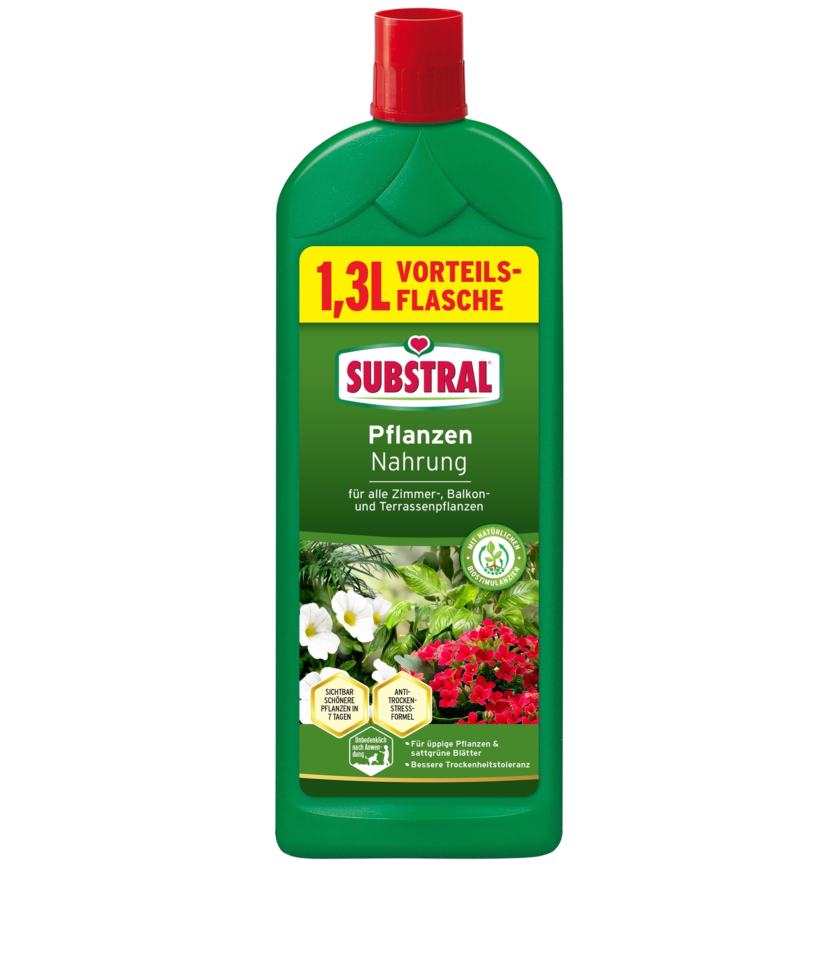 Pflanzen Nahrung Für alle Zimmer-, Balkon- und TerrassenpflanzenSUBSTRAL Pflanzen Nahrung ist ein hochwertiger Flüssigdünger mit natürlichen Biostimulanzien, der Ihre Pflanzen vom ersten Tag an mit allen wichtigen Haupt- und Spurennährstoffen versorgt. Er sichert ein prächtiges und gesundes Wachstum und stärkt gleichzeitig die Widerstandskraft bei Trockenheit oder schlechten Bodenbedingungen.