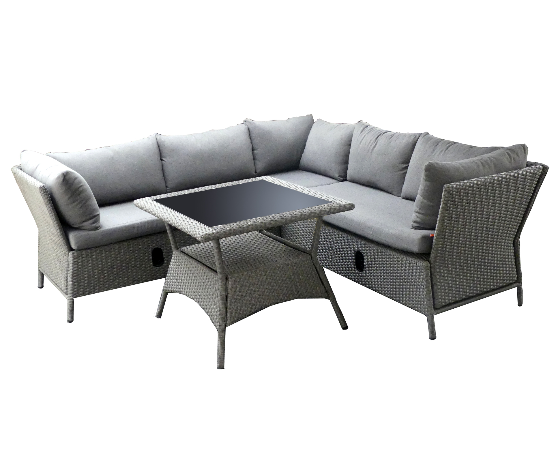Das Gestell des Sets besteht aus pulverbeschichtetem Aluminium und die Flächen sind aus hochwertigem Gardino®-Geflecht gefertigt. Inklusive sind bequeme Sitz- und Rückenkissen aus 100% Polyester, 220g/m².