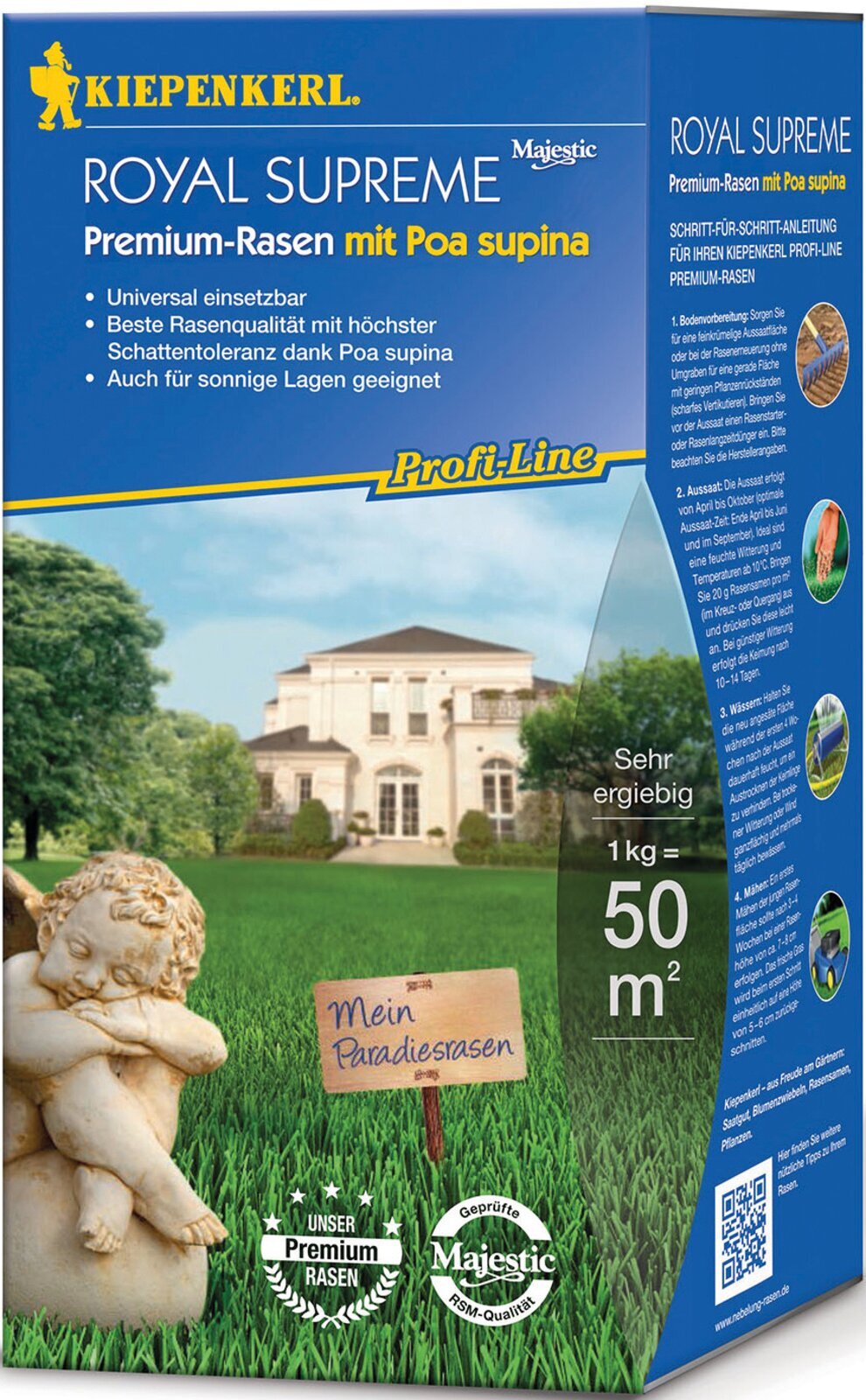 Der Kiepenkerl Rasen ‘Royal Supreme’ aus der Profi-Line bietet beste Rasenqualität durch bewusst ausgewählte, besonders schattenverträgliche Gräsersorten und -arten. Im Speziellen zeigt die Lägerrispe (Poa supina) als ausdauernde Grasart eine dauerhafte, zuverlässige Verträglichkeit und Toleranz gegen Schatten und Feuchtigkeit. So wird durch die Poa supina eine hohe Dichte des Rasens auch an halbschattigen und schattigen Standorten ermöglicht. Da ‘Royal Supreme’ universell einsetzbar ist, kann diese Mischung auch für sonnige Flächen genutzt werden. Wer sich an die empfohlene Aussaatzeit von Ende April bis Juni und im September hält, darf sich über satt-grüne, leuchtende Rasenflächen freuen. Wer sich für ein Kiepenkerl-Produkt aus der Profi-Line entscheidet, setzt auf beste Qualität, die sonst im professionellen Garten- und Landschaftsbau genutzt wird. Für Ihren Traumrasen wurden bei der Grasmischung unabhängig geprüfte Rasensorten mit Bestnoten nach RSM (Regel-Saatgutmischungen) ausgewählt, die zusätzlich empfohlen sind durch die FLL. Da diese Mischung eine geringe Aussaatmenge benötigt (ca. 20 g/m²), können Sie mit nur 1 kg ‘Royal Supreme’ eine Fläche von 50 m² begrünen.