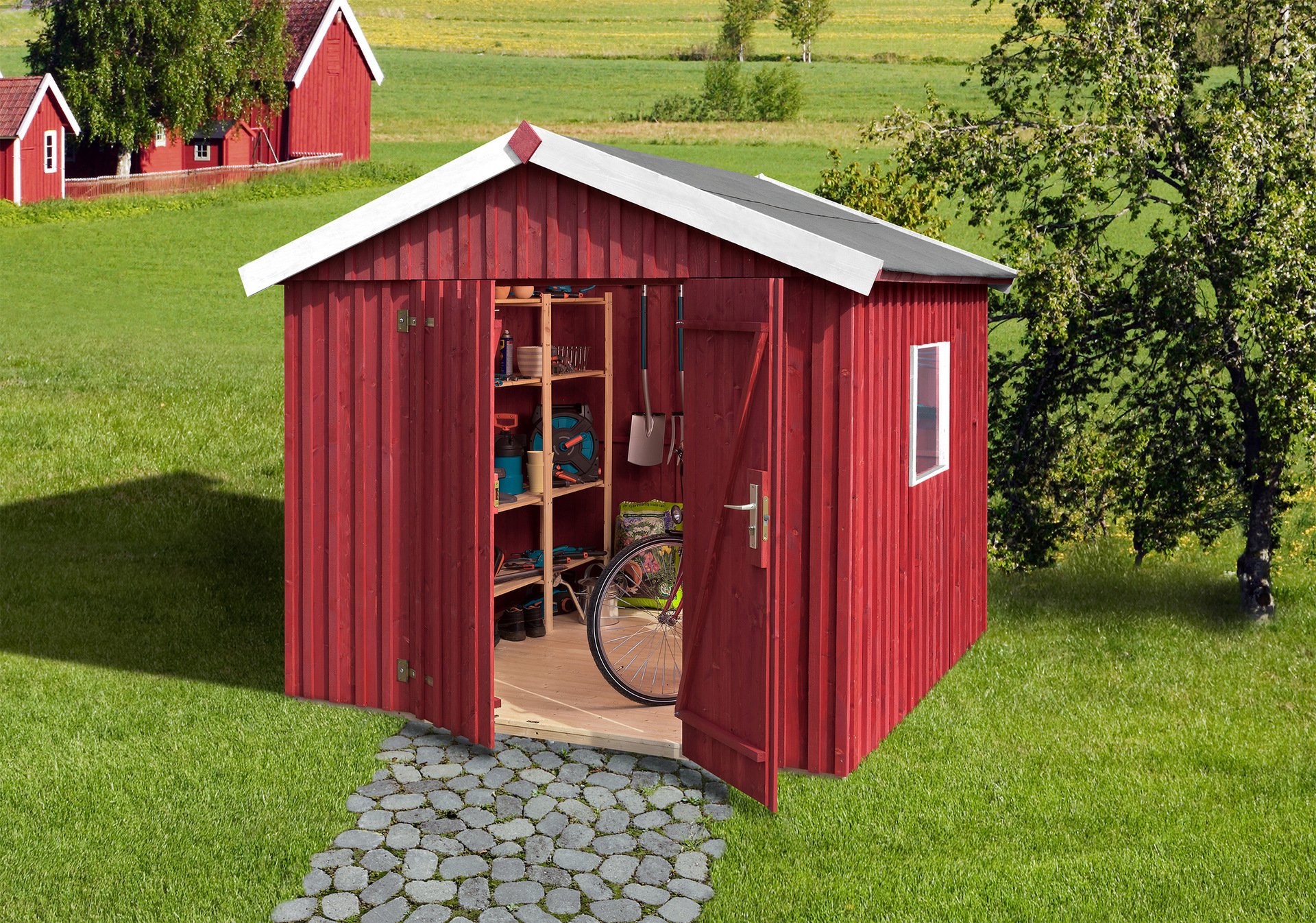 Schwedenhaus weka Schwedenhaus, Wand: 2 x 16 mm starke aufgedoppelte Schalung, sägerauhe Schwedenoptik Außenmaß: 162×170 cm (BxT) Gesamthöhe: 220 cm Seitenwandhöhe: 185 cm Bauweise: Elementbauweise Boden: 19 mm Massivholzboden Dach: 19 mm Massivholz-Satteldach Dachüberstände: vorn und seitlich 20 cm Fenster: 1 Fenster im Wandelement Tür: breite Einzeltür 76×176 cm (BxH) lichtes Maß Farbvariante: naturbelassen Das WEKA Schwedenhaus Gr. 1 lässt die Herzen der Schwedenfans höher schlagen. Auf Grund seiner Elementbauweise ist der Aufbau für das 162 x 170 cm (BxT) Gartenhäusschen problemlos machbar und bietet genügend Stauraum für Ihre Gartenutensilien oder Fahrräder. Für die nötige Stabilität des hochwertigen naturbelassenen Schwedenhaus sorgen der 19 mm stabile Massivholzboden, die 16 mm starke Deckelschalung als Wand und das 19 mm starke Massivholz-Satteldach. Schweden steht für die Affinität zur Natur und einem relaxten Lebensstil. Mit diesem Gartenhaus in traditioneller Optik holen Sie sich ein Stück dieser Lebensart in Ihren Garten nach Hause und Schweden scheint gar nicht mehr so weit weg zu sein. – B 162 x T 170 cm – 19 mm Massivholzboden – 19mm Massivholz-Satteldach – Wand: 2 x16 mm starke aufgedoppelte Schalung – in verschieen Größen erhältlich (BxT): – Gr.1: 162×170 cm – Gr.2: 162×246 cm – Gr.3: 240×246 cm