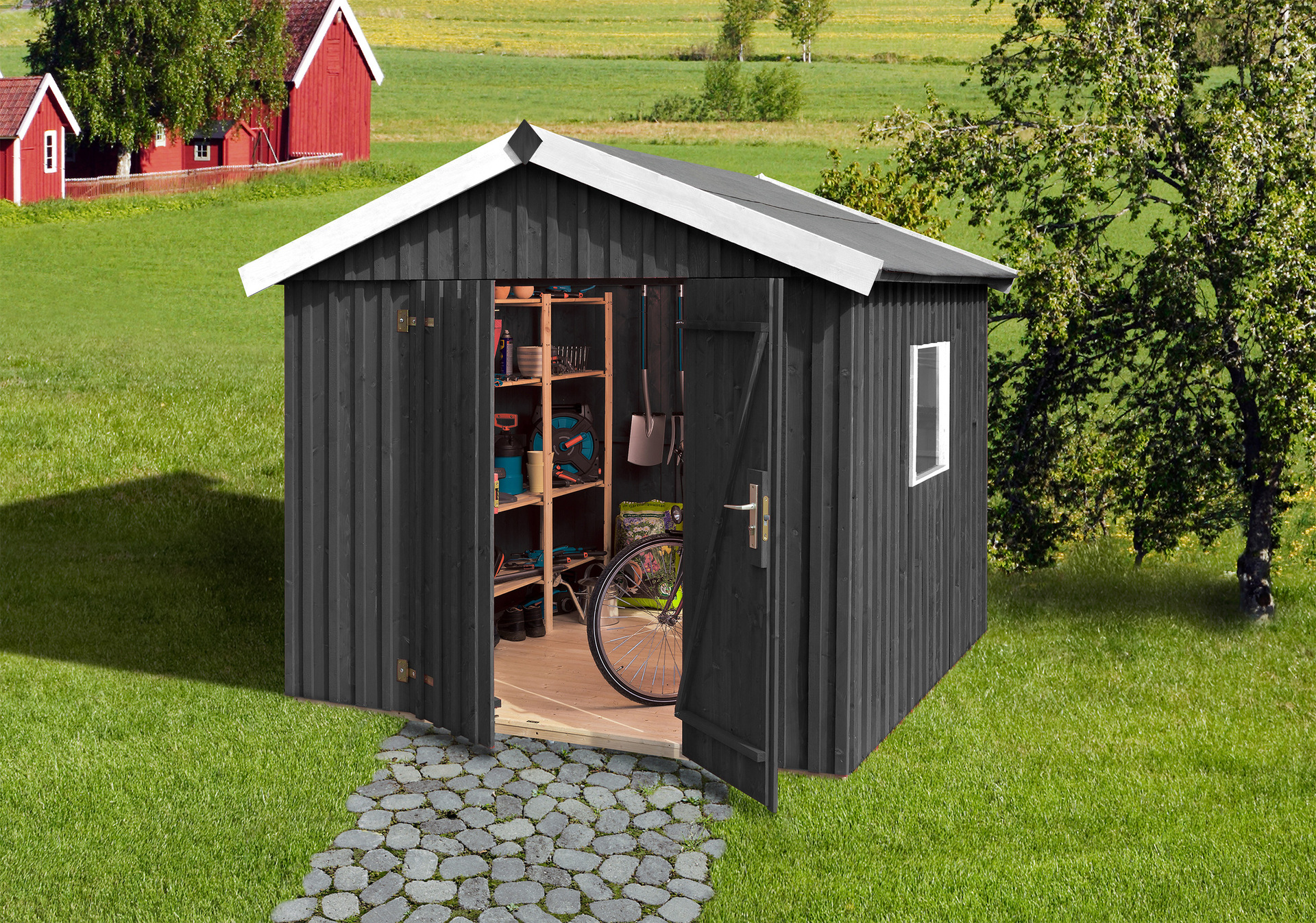 Schwedenhaus weka Schwedenhaus, Wand: 2 x 16 mm starke aufgedoppelte Schalung, sägerauhe Schwedenoptik Außenmaß: 162×170 cm (BxT) Gesamthöhe: 220 cm Seitenwandhöhe: 185 cm Bauweise: Elementbauweise Boden: 19 mm Massivholzboden Dach: 19 mm Massivholz-Satteldach Dachüberstände: vorn und seitlich 20 cm Fenster: 1 Fenster im Wandelement Tür: breite Einzeltür 76×176 cm (BxH) lichtes Maß Farbvariante: naturbelassen Das WEKA Schwedenhaus Gr. 1 lässt die Herzen der Schwedenfans höher schlagen. Auf Grund seiner Elementbauweise ist der Aufbau für das 162 x 170 cm (BxT) Gartenhäusschen problemlos machbar und bietet genügend Stauraum für Ihre Gartenutensilien oder Fahrräder. Für die nötige Stabilität des hochwertigen naturbelassenen Schwedenhaus sorgen der 19 mm stabile Massivholzboden, die 16 mm starke Deckelschalung als Wand und das 19 mm starke Massivholz-Satteldach. Schweden steht für die Affinität zur Natur und einem relaxten Lebensstil. Mit diesem Gartenhaus in traditioneller Optik holen Sie sich ein Stück dieser Lebensart in Ihren Garten nach Hause und Schweden scheint gar nicht mehr so weit weg zu sein. – B 162 x T 170 cm – 19 mm Massivholzboden – 19mm Massivholz-Satteldach – Wand: 2 x16 mm starke aufgedoppelte Schalung – in verschieen Größen erhältlich (BxT): – Gr.1: 162×170 cm – Gr.2: 162×246 cm – Gr.3: 240×246 cm