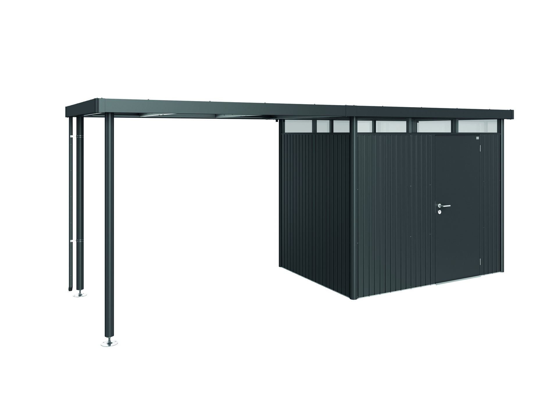 Das Seitendach wird am Gerätehaus HighLine® (ab Gr. H2) jeweils an der Seite mit der Regenrinne – wahlweise ein- oder beidseitig – fixiert. So entsteht eine überdachte Freifläche im Ausmaß der einfachen/doppelten Grundfläche des Gerätehauses. Die Alu-Stützen sind mit höhenverstellbaren Füßen ausgestattet. Regenfallrohr inkl. Die Dachfläche des Seitendaches ist immer quarzgrau-metallic!