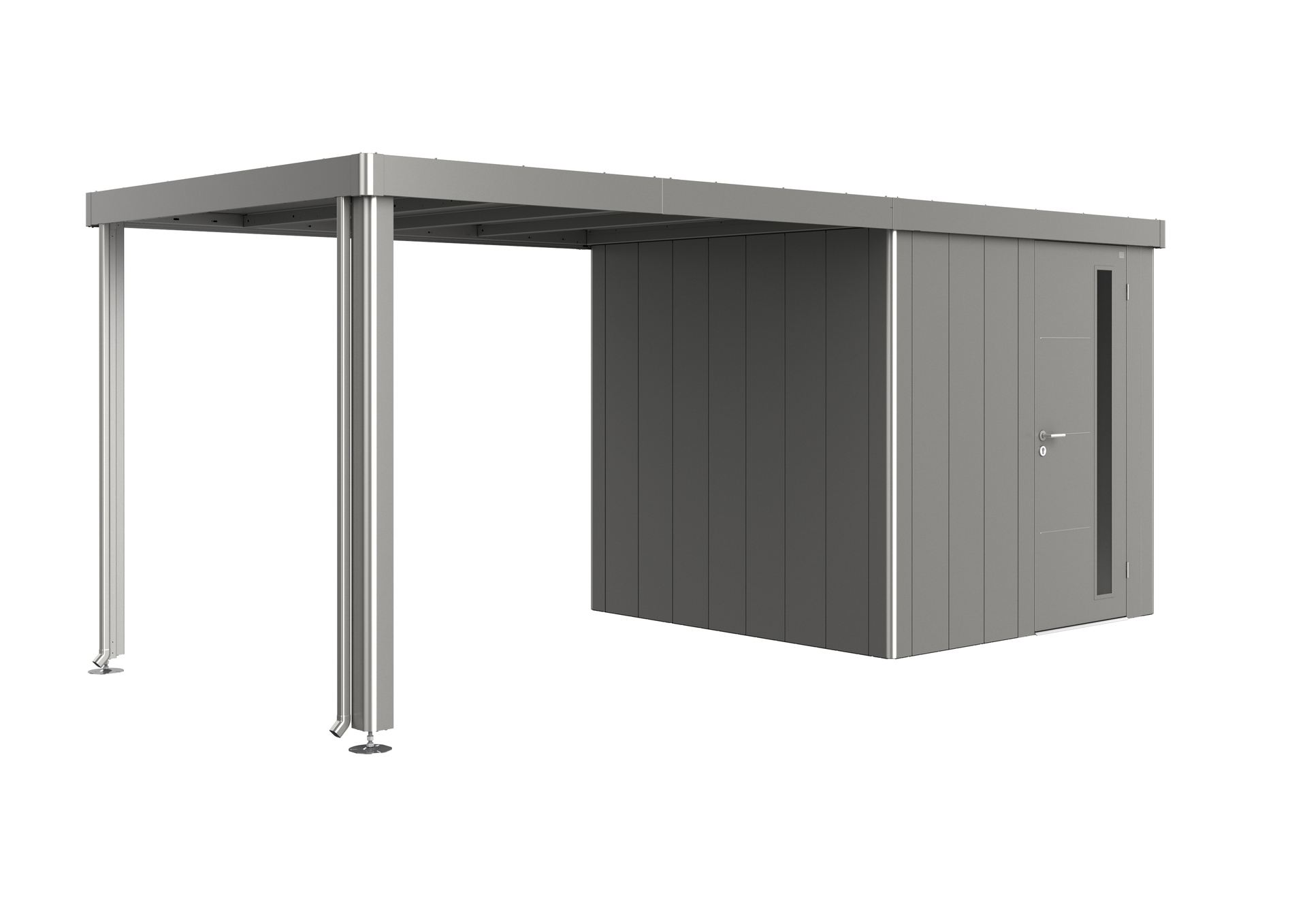 Das Seitendach wird am Gerätehaus Neo (ab Gr. 2A) wahlweise ein- oder beidseitig – fixiert. Die Breite des Seitendaches liegt bei 3 m. Die Alu-Stützen sind mit höhenverstellbaren Füßen ausgestattet. Zwei Regenfallrohre sind inkludiert.