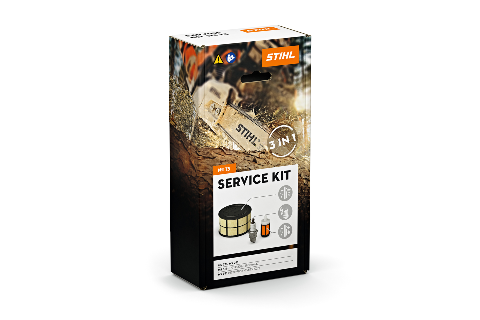 Im STIHL Service Kit 13 für MS 271, MS 291, MS 311 (Maschinennummer > 177198332; > 296246447) und MS 391 (Maschinennummer > 177197832; > 295938026) erhalten Sie folgende Komponenten für eine Standard-Wartung: