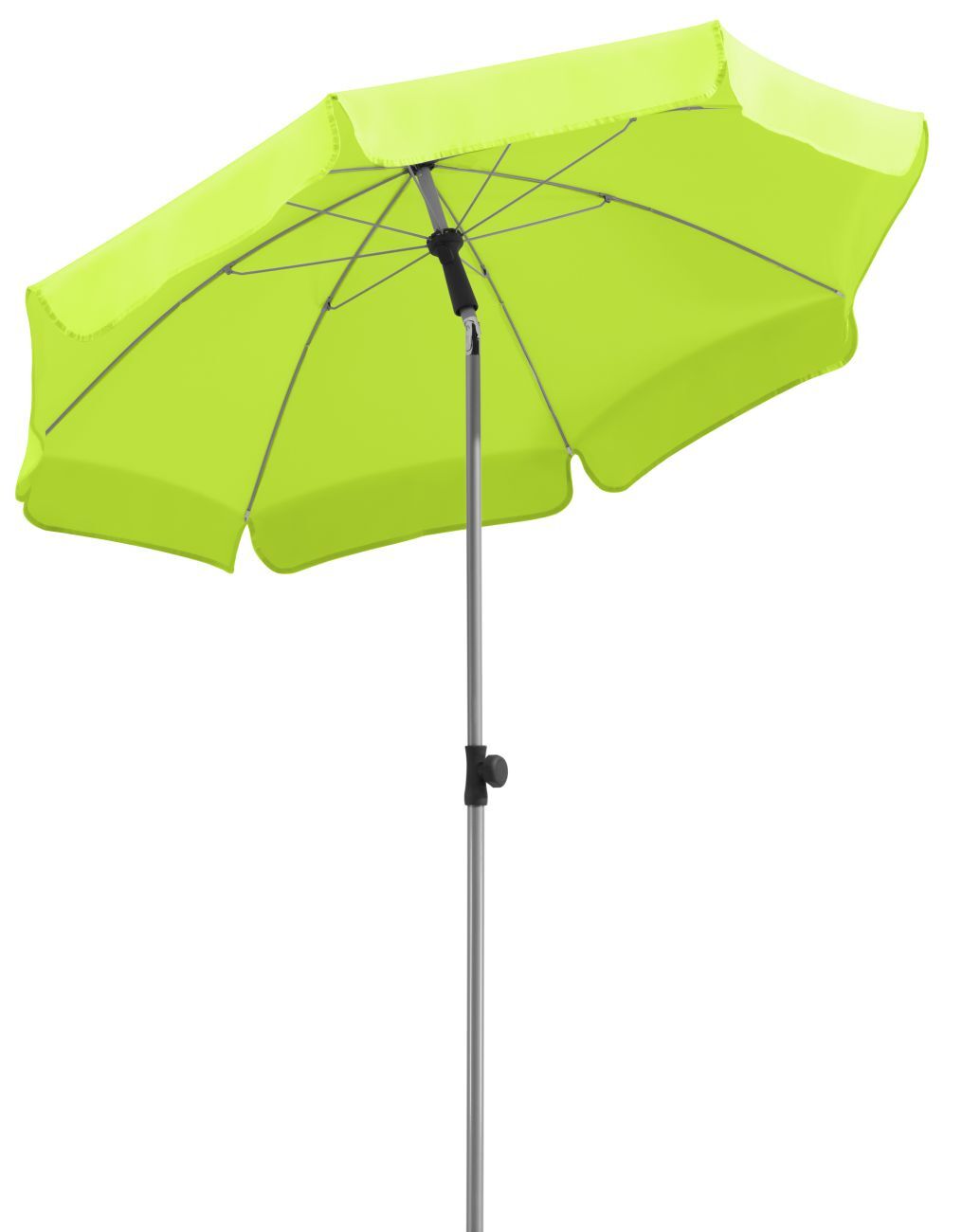 Außerdem besitzt der Schirm einen stabilen Metallknicker mit Druckknopf, wodurch ein müheloses Abknicken gewährleistet wird und der Schirm so entsprechend der Sonneneinstrahlung ausgerichtet werden kann.