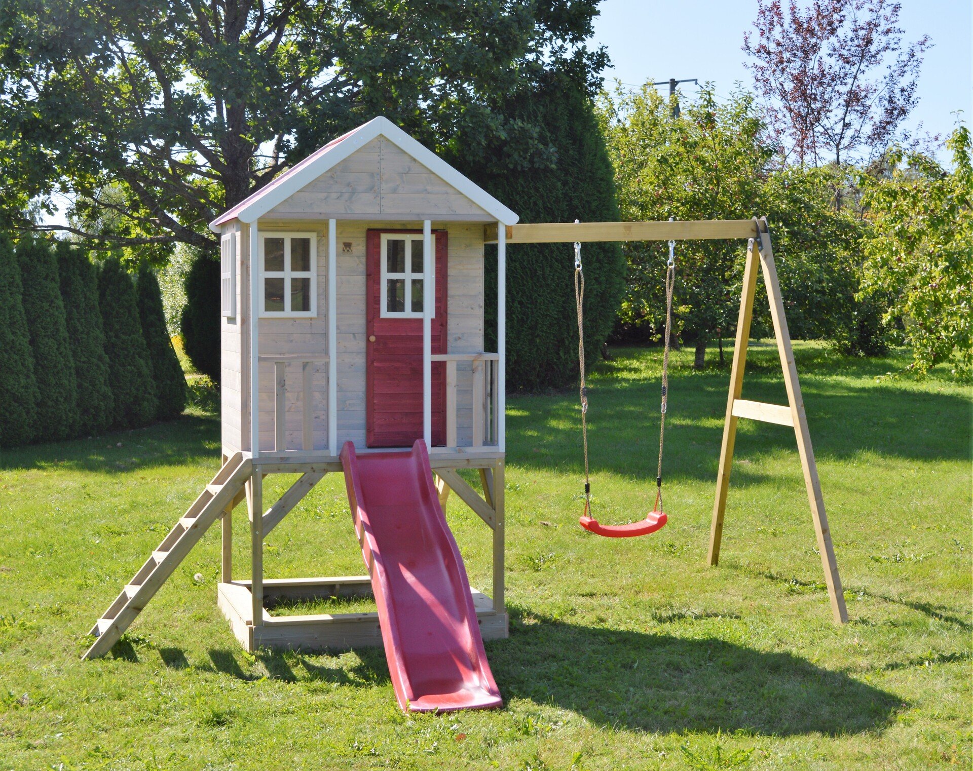 Spielhaus Alpaka Der Hersteller Wendi Toys aus Lettland entwickelt hochqualitative Spielgeräte und Spielplätze für Kinder. Getreu den Prinzipien von Wendi Toys — Einfachheit, Persönlichkeit und Sicherheit — erhält jedes Spielhaus seinen besonderen Flair. Das Kindergartenhaus mit vielen verspielten und modernen Details ist ideal für Kinder zwischen 3 bis 7 Jahren geeignet. Das Spielhaus bietet viel Platz zum Toben und genügend Rückzugsmöglichkeiten. Die Kinder können der Fantasie freien Lauf lassen und die Veranda mit Rutsche und Schaukel in vollen Zügen genießen. Das Spielhaus ist gegen Witterung gut geschützt, da es keine offenen Fenster oder Türen besitzt. Das Gartenspielhaus besteht aus nordisches Kiefern- und Fichtenholz und wird durch die roten Details und den weißen Zierelementen aufgewertet. Die Sicherheit Ihrer Kinder wird durch die hochwertige Verarbeitung und die abgerundeten Kanten gegeben. Das Gartenhaus wird in insgesamt sechs Boxen angeliefert, wodurch der Aufbau einfach “Schritt für Schritt“ durchgeführt werden kann. – Breite: 350, – Gewicht: 101,5, – Höhe: 242, – Länge: 290, – Material: Holz