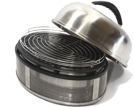 Supreme Der Cobb Grill Supreme besteht aus hochwertigen Materialien. Die Haube ist aus gebürstetem Edelstahl gefertigt. Das Modell Supreme bietet mehr Kapazität als der Cobb Grill Premier, eignet sich aber wie sein kleinerer Vorgänger ebenso gut zum Braten, Kochen, Räuchern, Grillen und sogar Backen. Die Zubereitung von Gerichten bis für 10 Personen stellt für den vielseitigen Holzkohlegrill kein Problem dar. Der Cobb Grill Supreme ist sehr leicht und trotz enormer Hitzenentwicklung im Inneren jederzeit mühelos tragbar, da sein Äußeres stets angenehm kühl bleibt. Damit ist der Cobb Grill der ideale Begleiter für unterwegs auf Ausflügen, Bootstouren, beim Camping oder am Strand. Kinder und Tiere können sich durch seine hochwertige Verarbeitung und den Hitzeschutz im inneren nicht verletzen. Auch auf dem Balkontisch lässt sich der Cobb Grill jederzeit platzieren, sodass wie beim Raclette die ganze Familie um den Tisch versammelt, ihr Grillgericht genießen kann. Durch seine variablen Bestandteile kann man den Cobb Supreme leicht zerlegen und reinigen. Die hochwertigen Materialien einfach mit einer weichen Bürste und Spülmittel säubern. ” – Farbe: silber, – Gewicht: 7, – Maße: 51cm x 36,5cm x 36cm, – Material: hochwertiges Edelstahl, Grillplatte teflonbeschichtet Grillaußenschale, Cobb Innenschale, Grillplatte, Deckel /Brikettkorb für 2 Cobble Stones