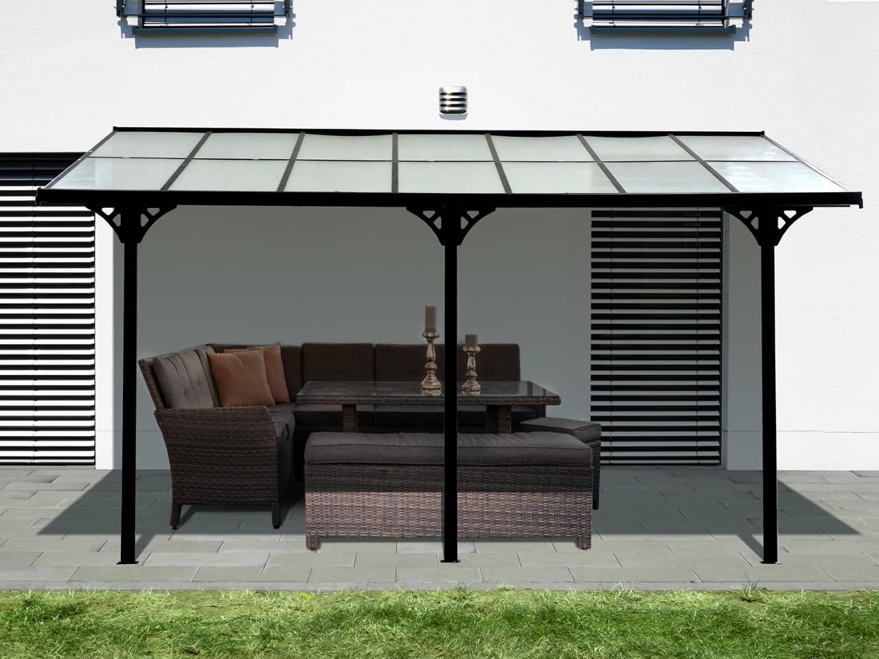 Terrassenüberdachung Bruce Ihre Westmann Terrassenüberdachung Die Westmann Terrassenüberdachung in zeitlosem Schwarz erweitert Ihren Außenbereich durch individuell nutzbaren und regengeschützten Wohnraum: Ob zum Zusammensitzen mit Freunden oder Familie, dem Relaxen auf der Gartenliege oder als praktische Möglichkeit zum Unterstellen von Auto, Quad und Co. — das Terrassendach von Westmann ist die ideale Lösung für Ihre Terrasse. Seine extreme Stabilität und Widerstandsfähigkeit erhält das Dach durch seinen Rahmen aus pulverbeschichtetem Aluminium. Gleichzeitig ist die Überdachung absolut wetterfest und so bestens für Ihren Außenbereich geeignet. Die 6mm starken Doppelstegplatten bilden die Dachfläche und ermöglichen einen hohen Lichteinfall. Das Dach trägt eine hohe Schneelast von 100kg/m² und auch die Dachneigung lässt sich frei nach Wunsch und optischen Vorlieben zwischen 225 und 270 cm wählen. Ein zuverlässiges Abfließen von Regenwasser und tauendem Schnee ist in jedem Fall garantiert. – Breite: 435, – Gewicht: 65, – Höhe: 225, – Länge: 300, – Material: Aluminium – Doppelstegplatte