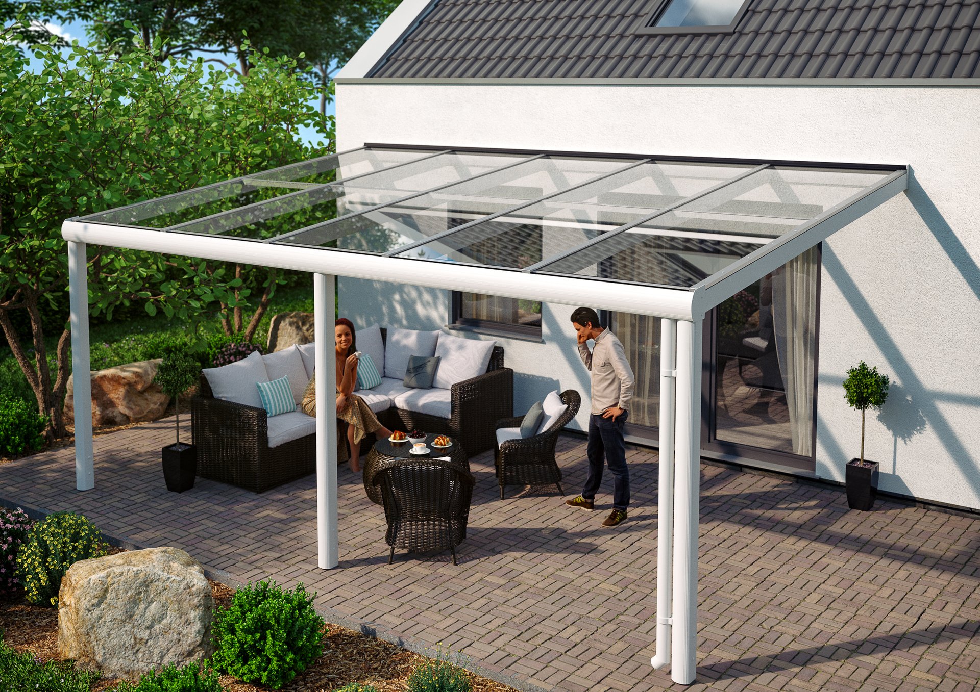 • Außenmaße 541 x 357 cm • hochwertige Konstruktion aus Aluminium, pulverbeschichtet in weiß (RAL 9016) • Pfosten 11 x 11 cm, vorne abgerundet, inkl. Pfostenlaschen zum Einbetonieren • modernes Design mit markanten Profillinien • Regenrinne in der Pfette integriert • Ablauf wahlweise im Pfosten oder außen am Pfosten • integriertes Wandabschlussprofil • Dacheindeckung aus 10 mm starkem Verbund-Sicherheits-Glas • Lieferung ohne Wandbefestigungsmaterial