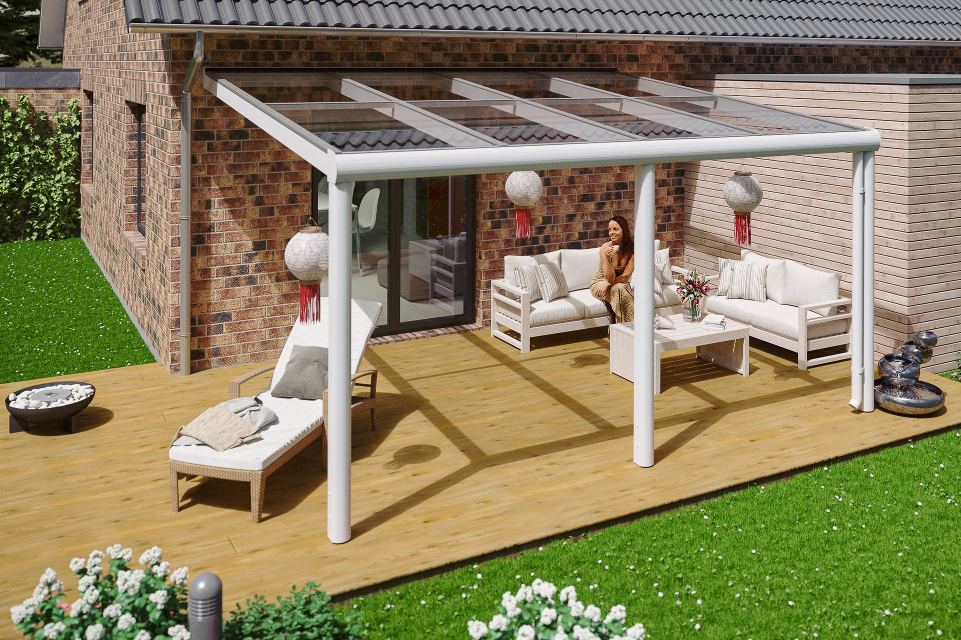 • Außenmaße 434 x 257 cm • hochwertige Konstruktion aus Aluminium, pulverbeschichtet in weiß (RAL 9016) • Pfosten 11 x 11 cm, vorne abgerundet, inkl. Pfostenlaschen zum Einbetonieren • modernes Design mit markanten Profillinien • Regenrinne in der Pfette integriert • Ablauf wahlweise im Pfosten oder außen am Pfosten • integriertes Wandabschlussprofil • Dacheindeckung aus 10 mm starkem Verbund-Sicherheits-Glas • Lieferung ohne Wandbefestigungsmaterial