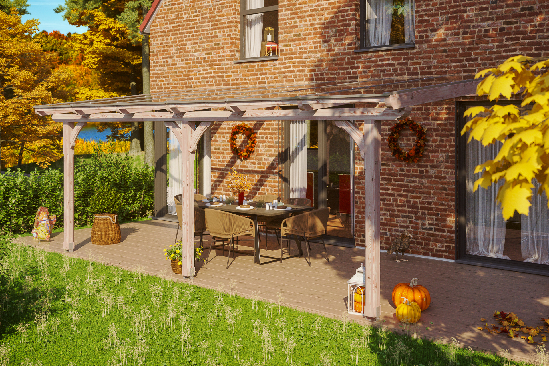• Außenmaße 648 x 350 cm • massive Konstruktion aus hochwertiger Douglasie • farblich unbehandelt • Pfosten 12 x 12 cm inkl. Aufschraubstützen • gefaste Pfosten, verzierte Sparren- und Pfettenenden sowie geschwungene Kopfbänder • Dacheindeckung 16 mm Polycarbonat-Doppelstegplatten in klar • Lieferung ohne Wandbefestigungsmaterial