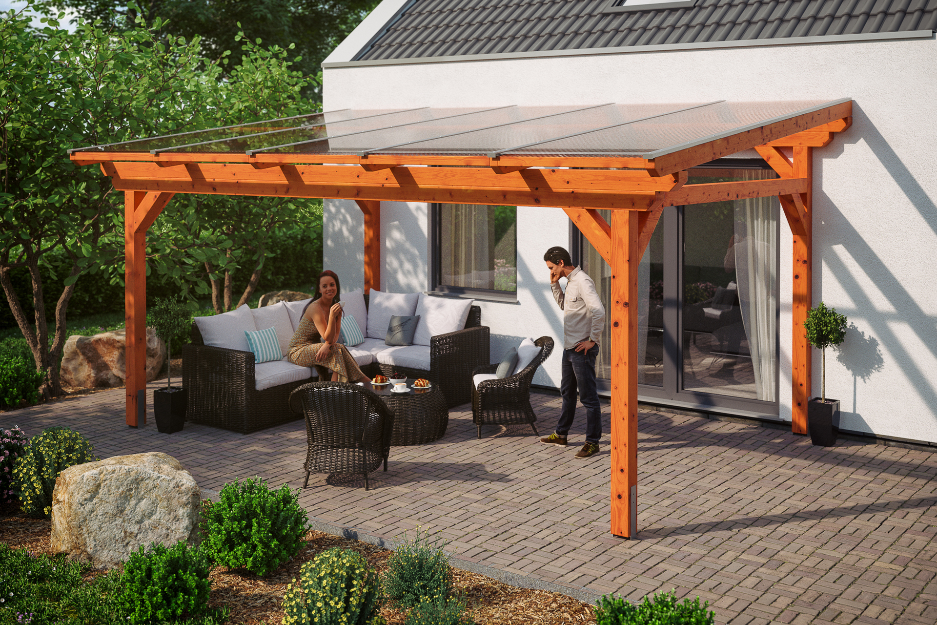• Außenmaße 541 x 400 cm • freistehend • massive Konstruktion aus hochwertigem Leimholz (BSH-Fichte) • farblich behandelt in eiche hell • Pfosten 12 x 12 cm inkl. H-Pfostenanker • stabile Doppelpfettenkonstruktion ohne Mittelpfosten • Dacheindeckung 16 mm Polycarbonat-Doppelstegplatten in klar