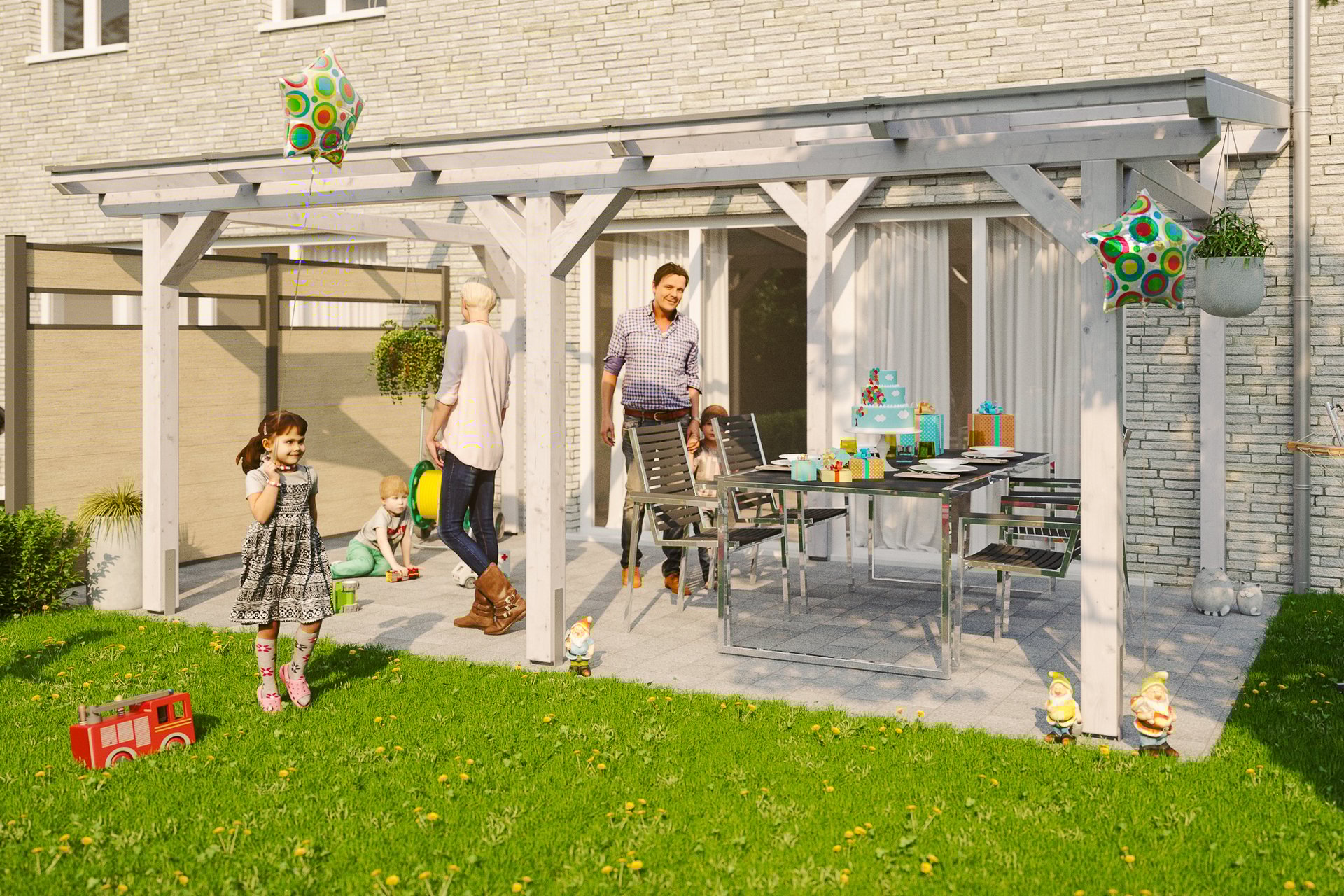 • Außenmaße 541 x 350 cm • freistehend • massive Konstruktion aus hochwertigem Leimholz (BSH-Fichte) • farblich behandelt in weiß • Pfosten 12 x 12 cm inkl. H-Pfostenanker • Dacheindeckung 16 mm Polycarbonat-Doppelstegplatten in klar