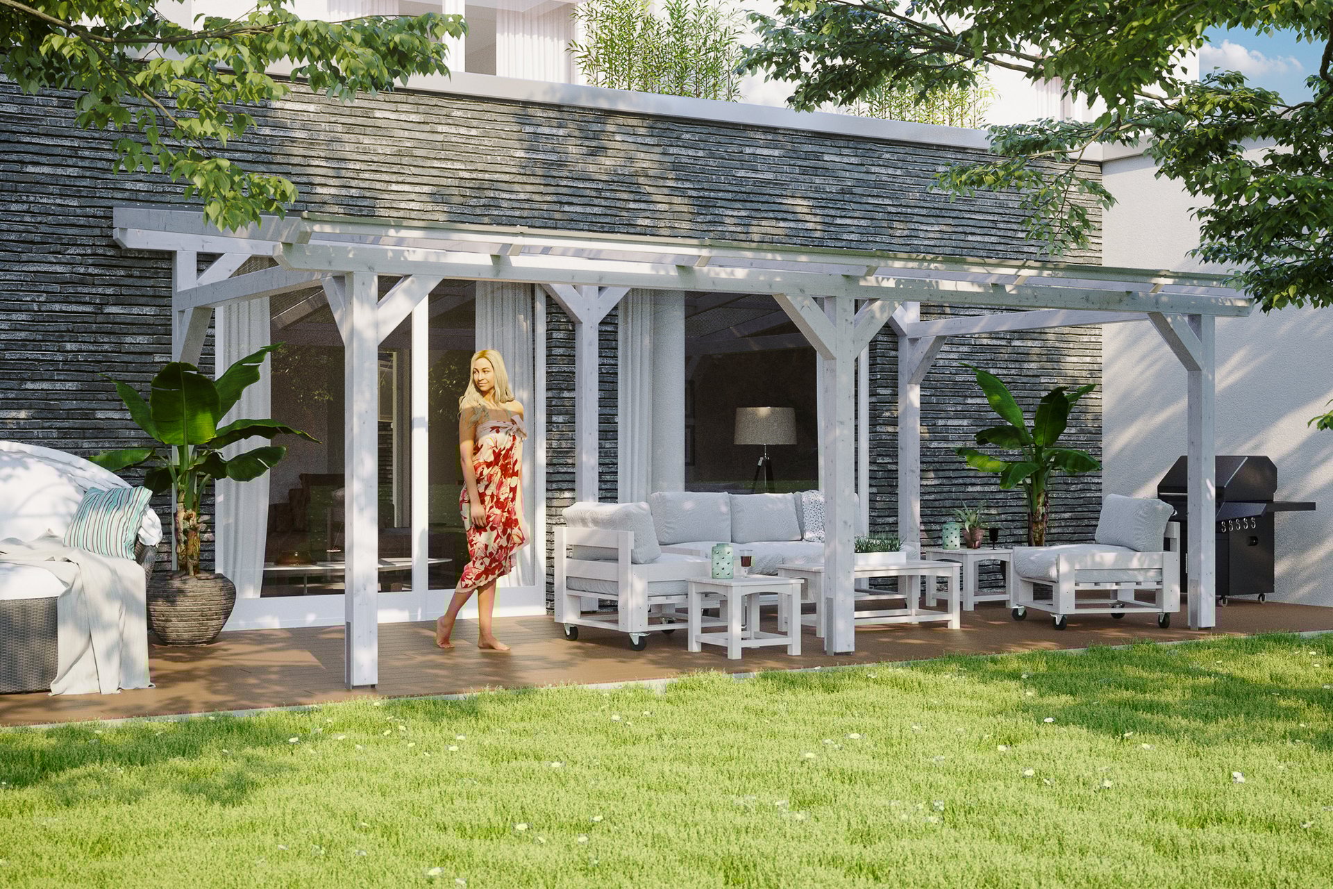 • Außenmaße 648 x 400 cm • freistehend • massive Konstruktion aus hochwertigem Leimholz (BSH-Fichte) • farblich behandelt in weiß • Pfosten 12 x 12 cm inkl. H-Pfostenanker • Dacheindeckung 16 mm Polycarbonat-Doppelstegplatten in klar