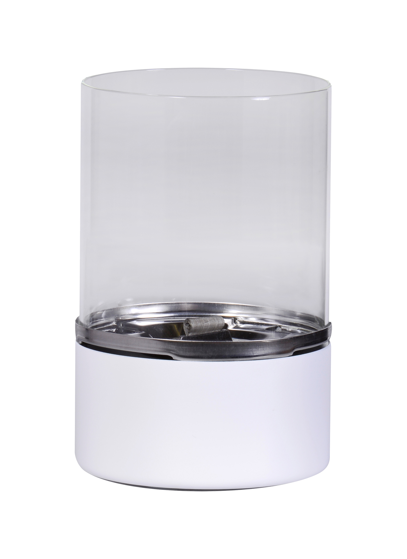 Tenderflame Tischfeuer “Turm” – geruchloses, sicheres, rückbrand- und rußfreies Tischfeuer. Mit weißem Fuß und Glasring. Der 300 ml Tank erlaubt eine Brennzeit von bis zu 7 Stunden am patentierten Edelstahldocht.