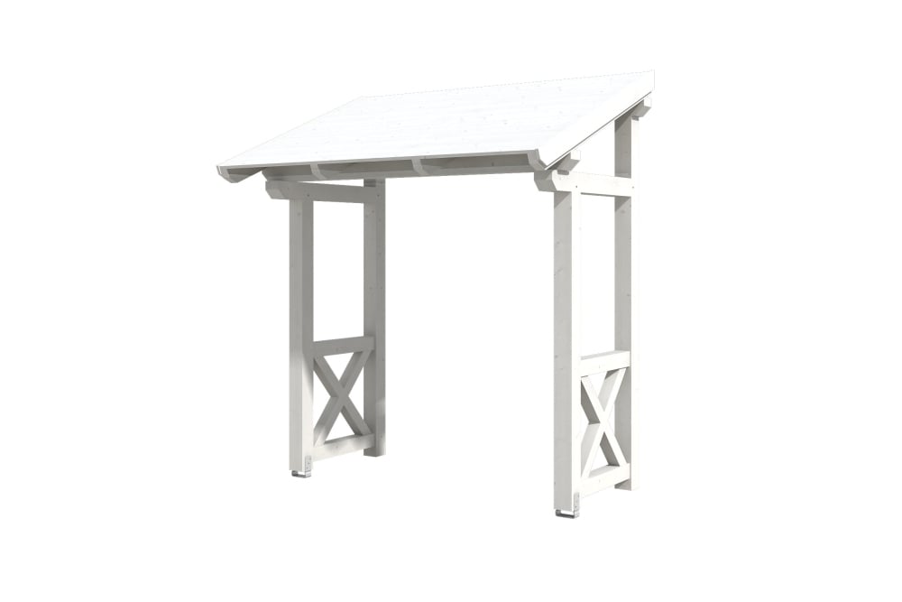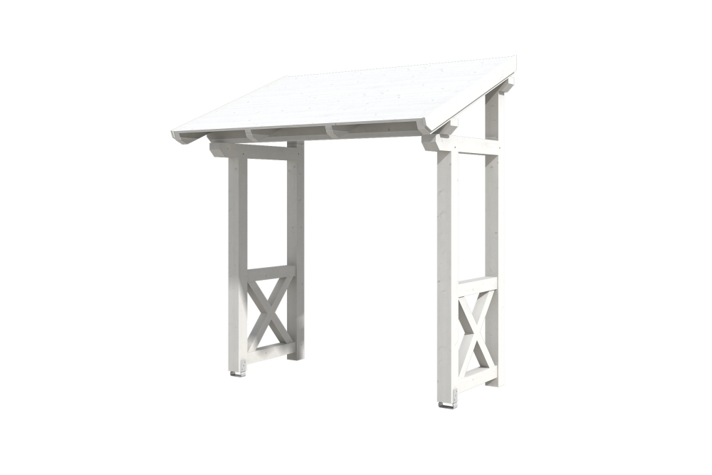• Außenmaße 242 x 156 cm • massive Konstruktion aus hochwertigem Konstuktionvollholz (KVH-Fichte) • farblich behandelt in weiß • Ständer 12 x 12 cm • Pfetten 12 x 12 cm • Sparren 6 x 12 cm • echte Zapfen-Verbindungen • gekervte Sparren • inkl. 2 Aufschraubstützen • 20 mm Dachschalung • Dachschindeln als Zubehör erhältlich • Lieferung ohne Wandbefestigungsmaterial