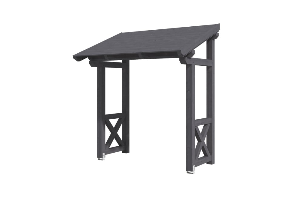 • Außenmaße 242 x 156 cm • massive Konstruktion aus hochwertigem Konstuktionvollholz (KVH-Fichte) • farblich behandelt in schiefergrau • Ständer 12 x 12 cm • Pfetten 12 x 12 cm • Sparren 6 x 12 cm • echte Zapfen-Verbindungen • gekervte Sparren • inkl. 2 Aufschraubstützen • 20 mm Dachschalung • Dachschindeln als Zubehör erhältlich • Lieferung ohne Wandbefestigungsmaterial