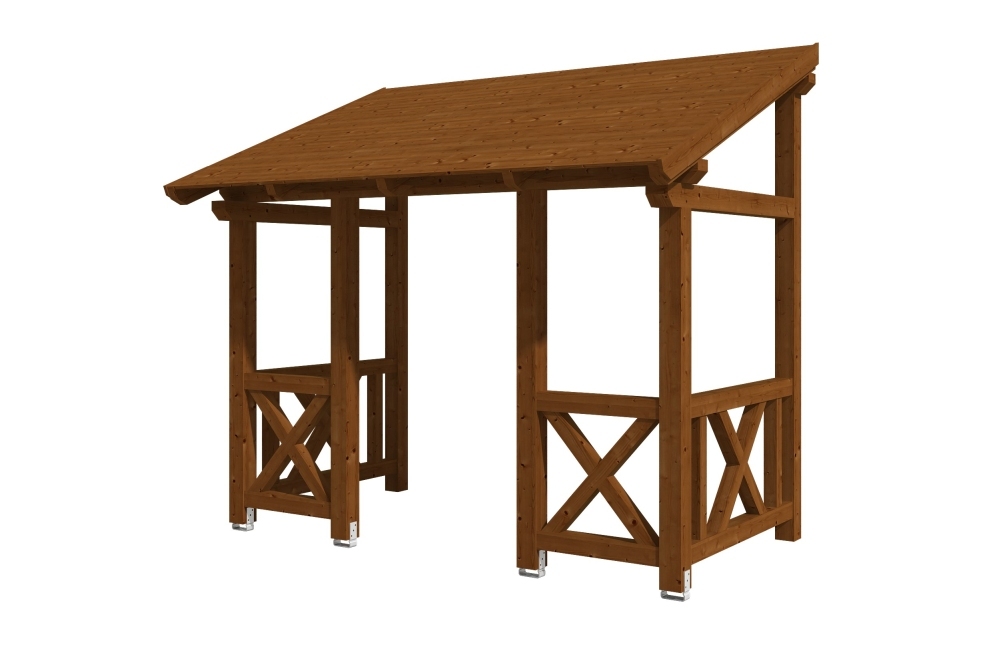 • Außenmaße 336 x 202 cm • massive Konstruktion aus hochwertigem Konstuktionvollholz (KVH-Fichte) • farblich behandelt in nussbaum • Ständer 12 x 12 cm • Pfetten 12 x 12 cm • Sparren 6 x 12 cm • echte Zapfen-Verbindungen • gekervte Sparren • inkl. 4 Aufschraubstützen • 20 mm Dachschalung • Dachschindeln als Zubehör erhältlich • Lieferung ohne Wandbefestigungsmaterial