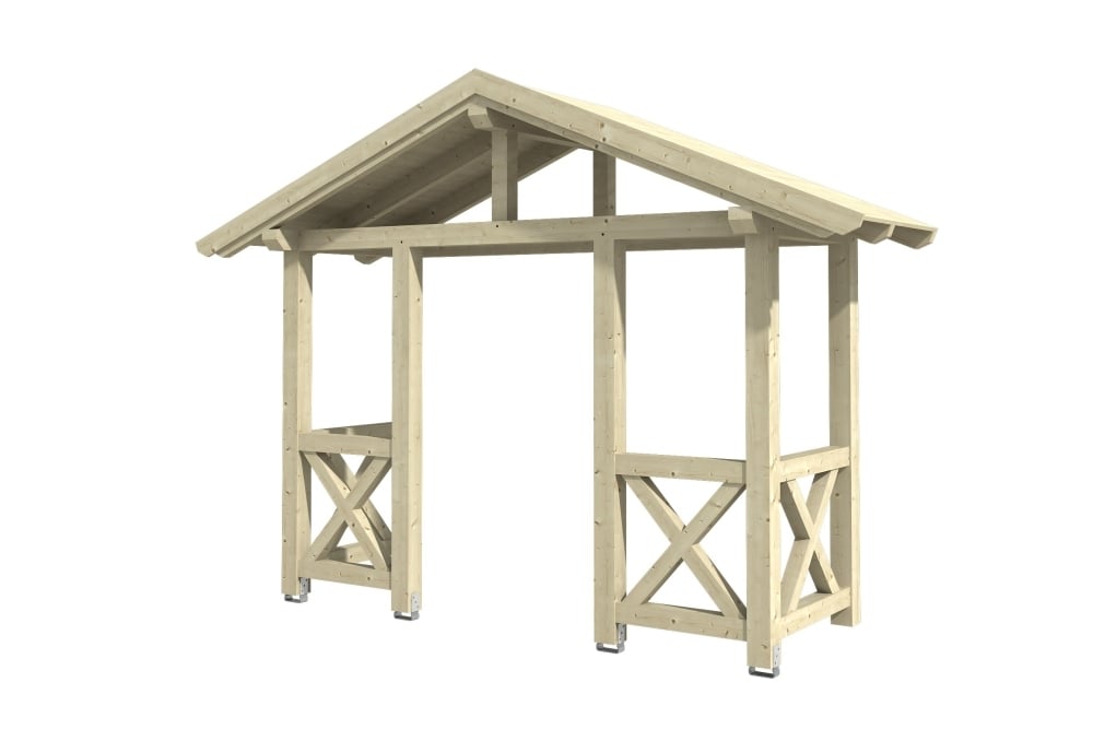 • Außenmaße 360 x 139 cm • massive Konstruktion aus hochwertigem Konstuktionvollholz (KVH-Fichte) • farblich unbehandelt • Ständer 12 x 12 cm • Pfetten 12 x 12 cm • Sparren 6 x 12 cm • echte Zapfen-Verbindungen • gekervte Sparren • inkl. 4 Aufschraubstützen • 20 mm Dachschalung • Dachschindeln als Zubehör erhältlich • Lieferung ohne Wandbefestigungsmaterial