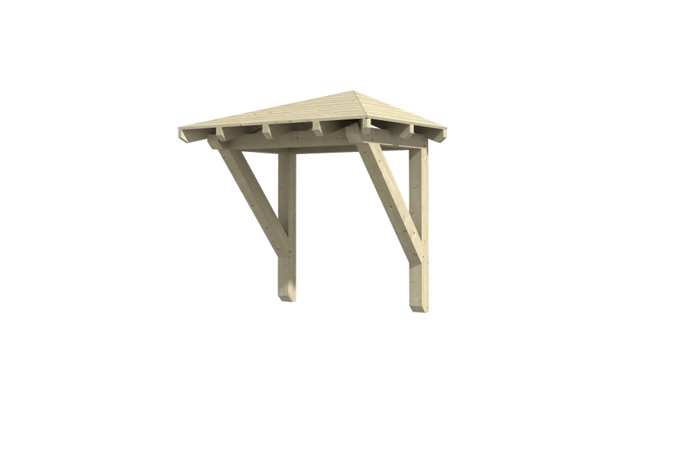 • Außenmaße 188 x 126 cm • massive Konstruktion aus hochwertigem Konstuktionvollholz (KVH-Fichte) • farblich unbehandelt • Ständer 12 x 12 cm • Pfetten 12 x 12 cm • Sparren 6 x 12 cm • echte Zapfen-Verbindungen • gekervte Sparren • abgeschrägte Gratsparren • 20 mm Dachschalung • Dachschindeln als Zubehör erhältlich • Lieferung ohne Wandbefestigungsmaterial