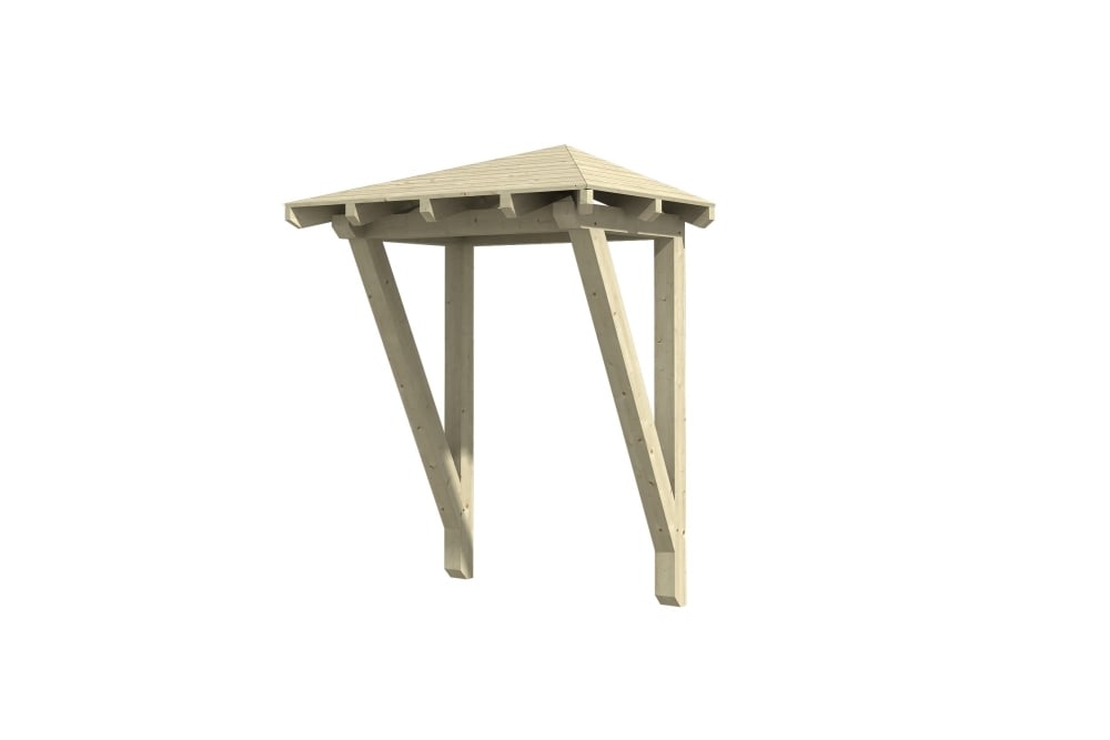 • Außenmaße 188 x 126 cm • massive Konstruktion aus hochwertigem Konstuktionvollholz (KVH-Fichte) • farblich unbehandelt • Ständer 12 x 12 cm • Pfetten 12 x 12 cm • Sparren 6 x 12 cm • echte Zapfen-Verbindungen • gekervte Sparren • abgeschrägte Gratsparren • 20 mm Dachschalung • Dachschindeln als Zubehör erhältlich • Lieferung ohne Wandbefestigungsmaterial