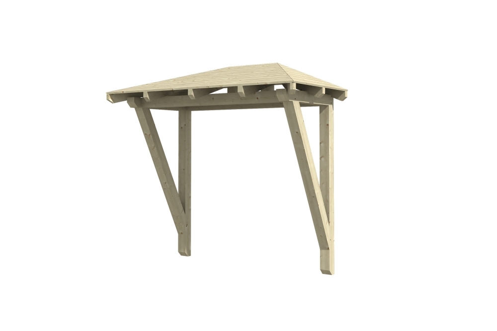 • Außenmaße 258 x 126 cm • massive Konstruktion aus hochwertigem Konstuktionvollholz (KVH-Fichte) • farblich unbehandelt • Ständer 12 x 12 cm • Pfetten 12 x 12 cm • Sparren 6 x 12 cm • echte Zapfen-Verbindungen • gekervte Sparren • abgeschrägte Gratsparren • 20 mm Dachschalung • Dachschindeln als Zubehör erhältlich • Lieferung ohne Wandbefestigungsmaterial