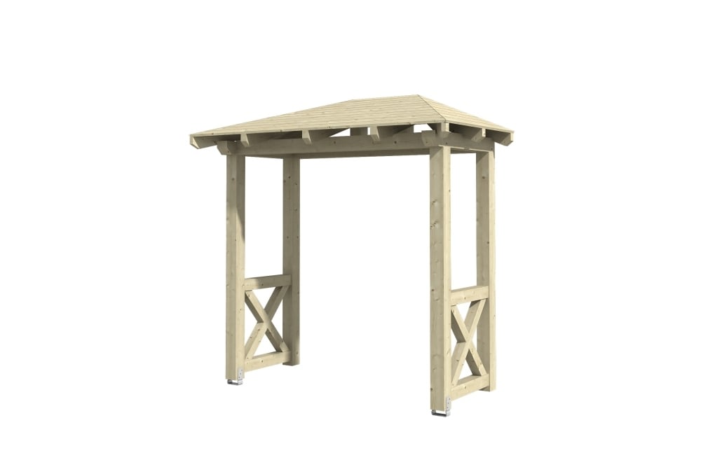 • Außenmaße 258 x 126 cm • massive Konstruktion aus hochwertigem Konstuktionvollholz (KVH-Fichte) • farblich unbehandelt • Ständer 12 x 12 cm • Pfetten 12 x 12 cm • Sparren 6 x 12 cm • echte Zapfen-Verbindungen • gekervte Sparren • abgeschrägte Gratsparren • inkl. 2 Aufschraubstützen • 20 mm Dachschalung • Dachschindeln als Zubehör erhältlich • Lieferung ohne Wandbefestigungsmaterial