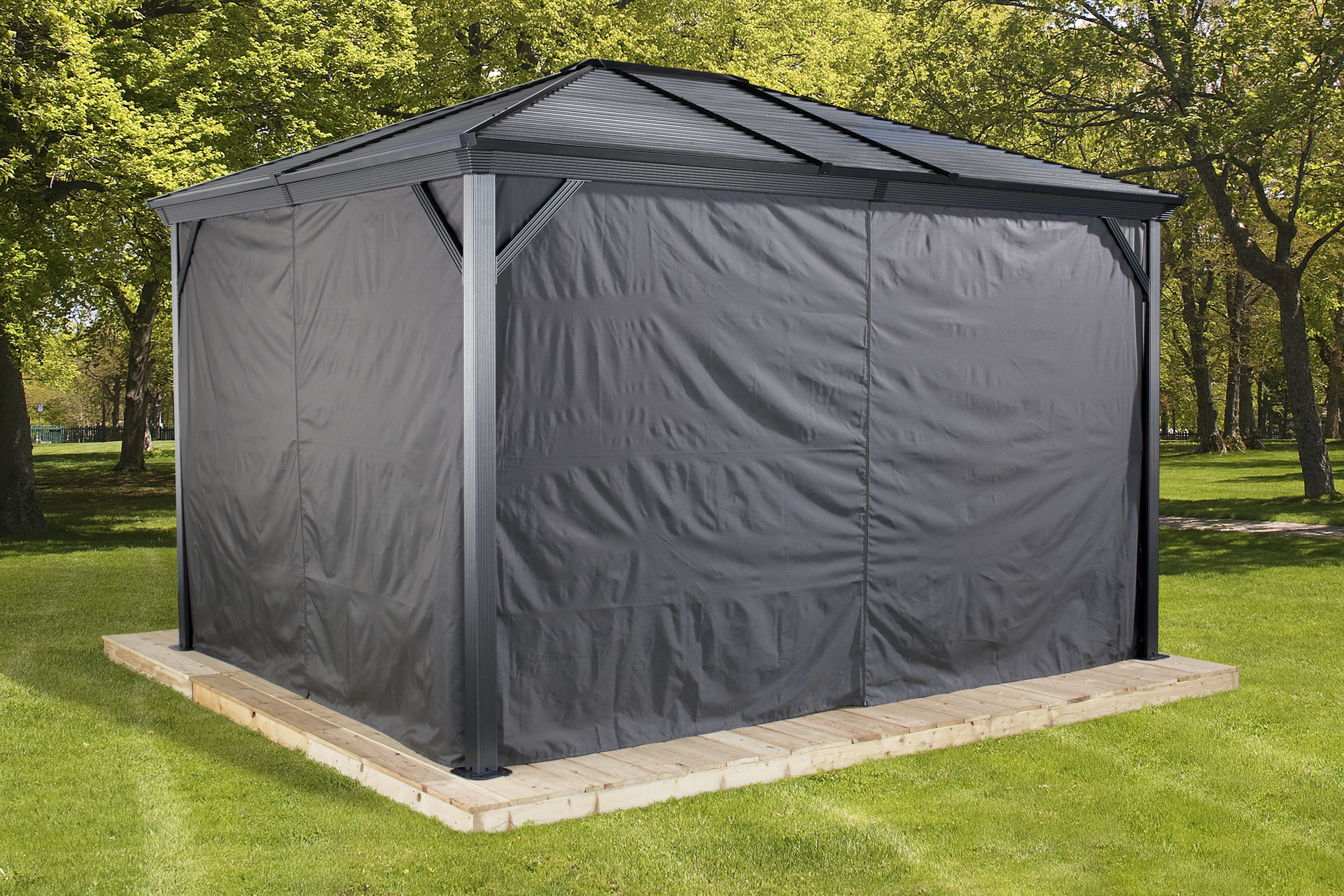Vorhang-Set für Pavillon Vorhang-Set passend zum Pavillon Ventura 10×14 Das Vorhangset ist für den kompletten Pavillon und deckt alle Seiten ab. Durch ein zweigleisiges Laufschienensystem werden die Vorhänge in einer anderen Schiene als die Moskitonetze angebracht. Die Vorhänge werden im geschlossenen Zustand ausschließlich mit den Clips befestigt. Im geöffneten Zustand werden die Vorhänge zusätzlich mit einer Schlaufe an den Pfosten befestigt. Eingang in den Pavillon an jeder Seite mit Reißverschlusstür. Bitte beachten Sie, dass die Vorhänge nicht mit einem Haken fixiert werden dürfen. Bei Wind kann die Öse ausreißen und der Vorhang beschädigt werden. Wir empfehlen die Vorhänge im Winter trocken einzulagern und nicht als Winterschutz o. Ä. zu nutzen. – Gewicht: 10