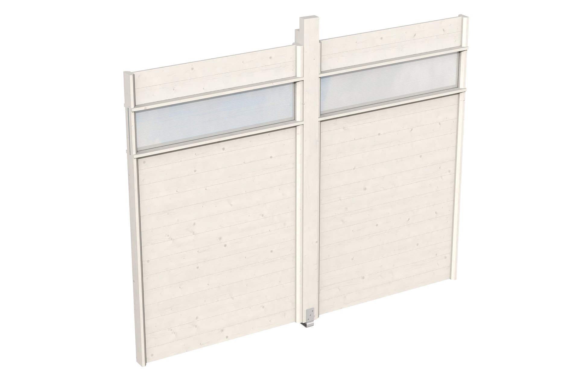 • Lichtband aus Polycarbonat Doppelstegplatte in klar • Breite: 270 cm • Höhe: 209 cm • Stärke Pfosten: 12 x 12 cm • Stärke Nut- und Federbretter: 1,9 x 11,7 cm • Inklusive Aufschraubstütze • Material: Nordische Fichte • Farbbehandelt in Weiß