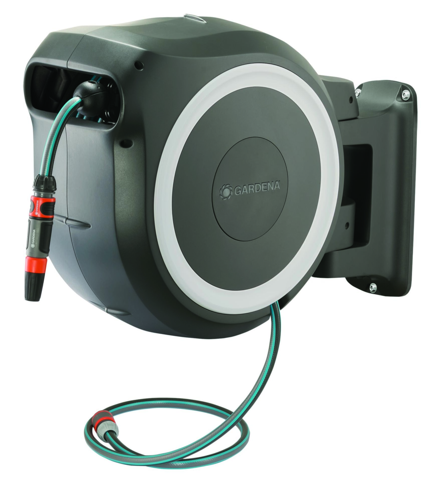 Wand-Schlauchbox RollUp M/L (weiß) 25 m Mit der Wand-Schlauchbox RollUp M/L ist der Gartenschlauch sofort einsatzbereit und nach der Bewässerung schnell und ohne zu verknoten verwahrt, geschützt vor Schmutz und Beschädigungen. Mit kurzen Arretierstopps kann der Schlauch auf die gewünschte Länge ausgezogen werden. Dank RollControl genügt ein kurzer Zug am Schlauch und er wird mit gleichmäßiger Geschwindigkeit und sicher automatisch wieder aufgerollt. Die Wandhalterung ist um 180° schwenkbar, mit praktischer Halterung zum Aufbewahren von Spritzen oder Brausen. Die Wandschlauchbox ist frostsicher. Mit 25 m Qualitätsschlauch 13 mm (1/2″), Anschlussschlauch, Original Systemteilen und Spritze. Inklusive Wandhalterung mit Schrauben, Dübeln und Montagehilfe. Mit Diebstahlsicherung. 5 Jahre Garantie.